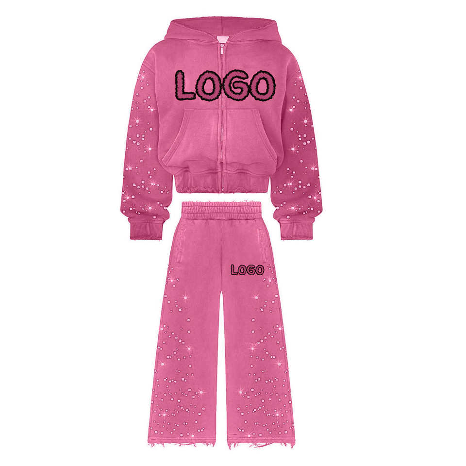 Heavyweight Distressed Embroidery Sunfaded Zip up Acid Wash Hoodie Flare Sweatpants Set Vintage Tracksuit