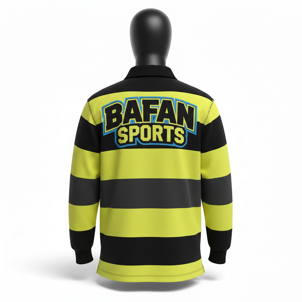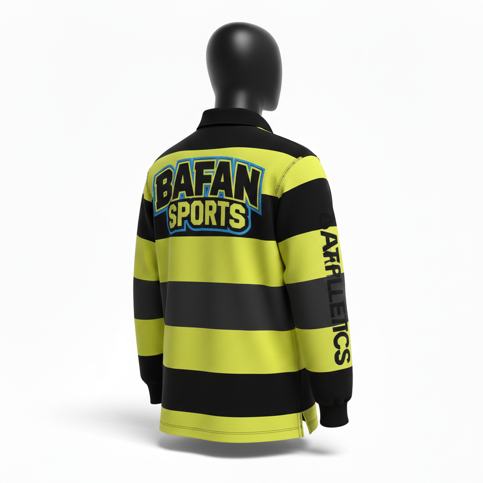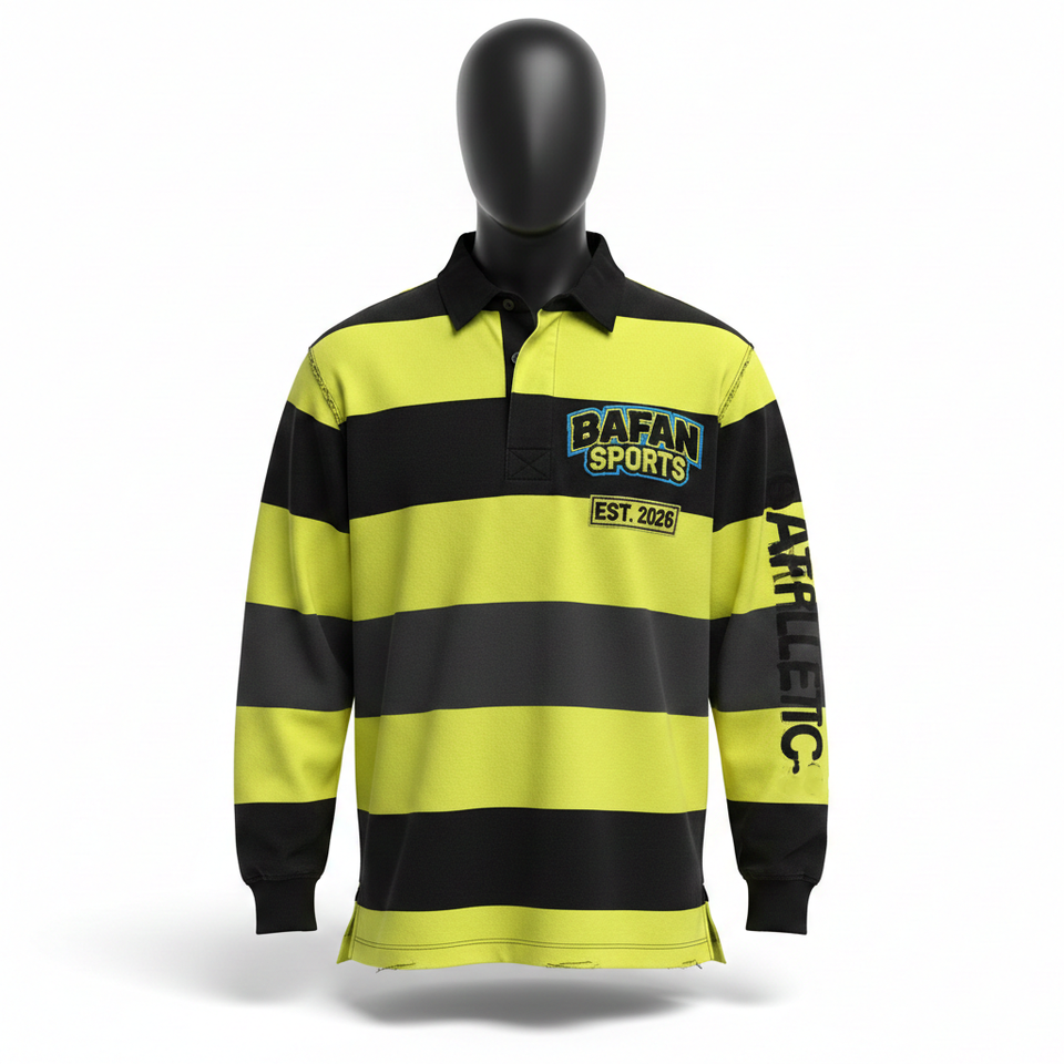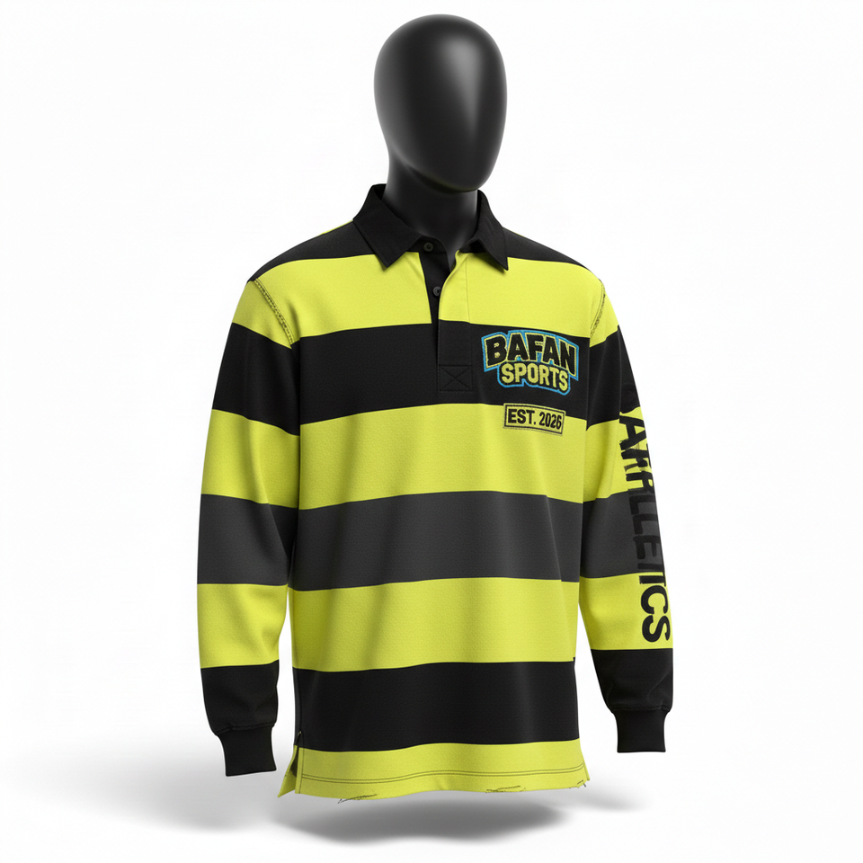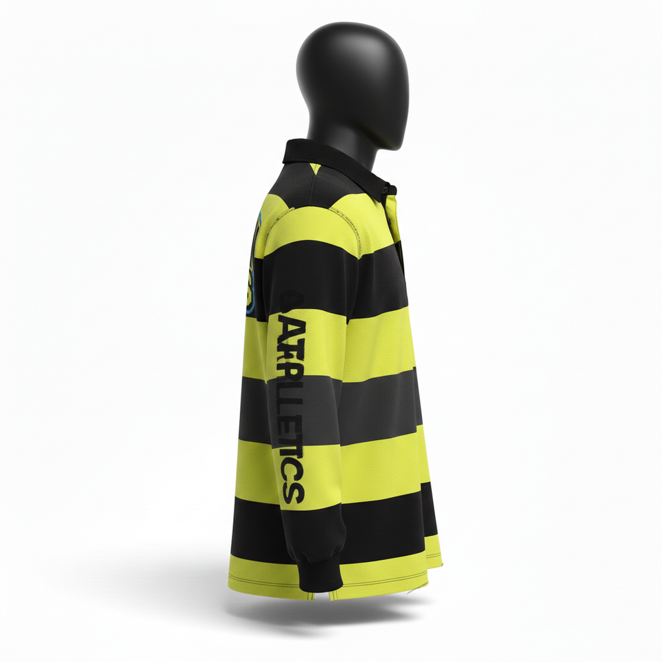 Polo de rugby pour homme en coton et polyester tricoté, rayé noir et jaune, avec patch personnalisé, pour chemises polo