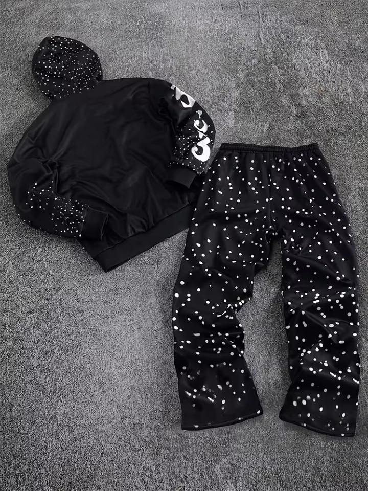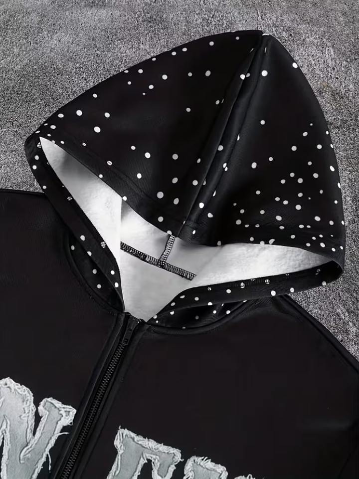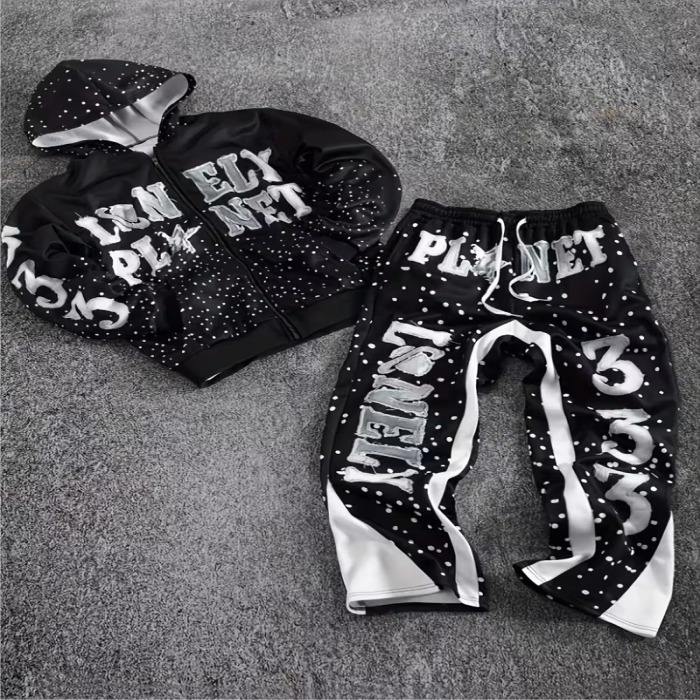 Ensemble de survêtement épais et oversize avec sweat à capuche zippé à strass effet diamant et pantalon de survêtement à double taille, effet délavé effet boue