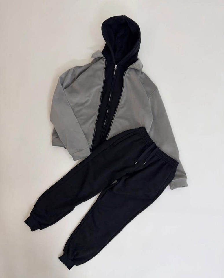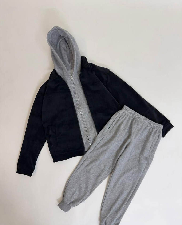 Heavyweight 100% Cotton Fleece Breathable Premium Classic Versatile Winter Tracksuit in Black and Gray