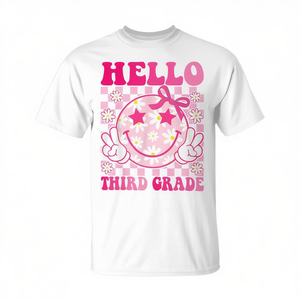 T-shirt Hello Third Grade Girl à carreaux roses avec visage souriant, design pour la rentrée scolaire de la 3ème année