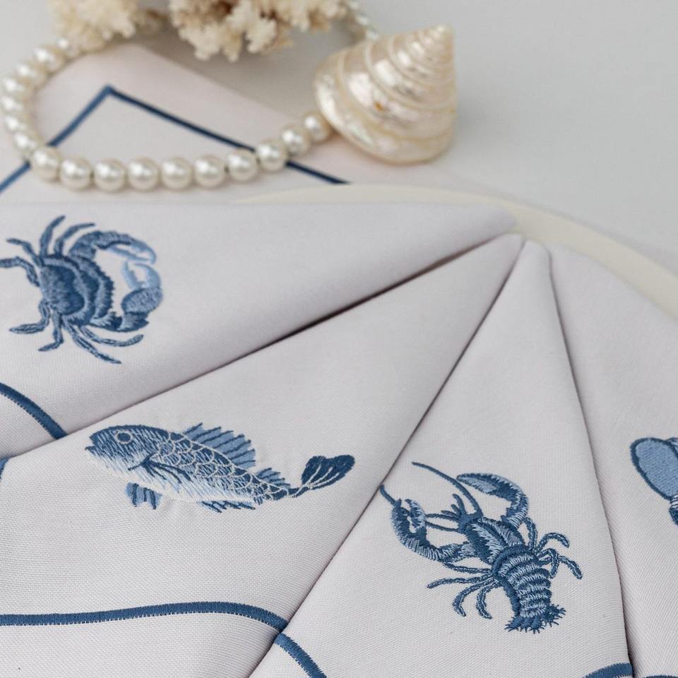 Serviettes de table en lin à ourlet festonné, animaux marins brodés - Homard, style japonais, couleur et taille personnalisées pour hôtel, restaurant