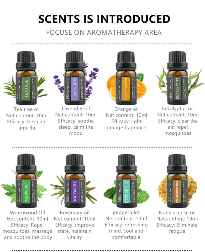 TEA TREE, Rosemary, Rose, Eucalyptus, Lavender, Lemon, Cedar, Orange, LIME, Jasmine, Grapefruit, Ginger, Chamomile, Frankincense, Bergamot, Pine, Rosewood, Peppermint, Patchouli, Cinnamon, Clove, Thyme, Ylang-Ylang, Lemon Grass, Myrrh, lemongrass, patchouli oil, peppermint oil, pine needleingredient