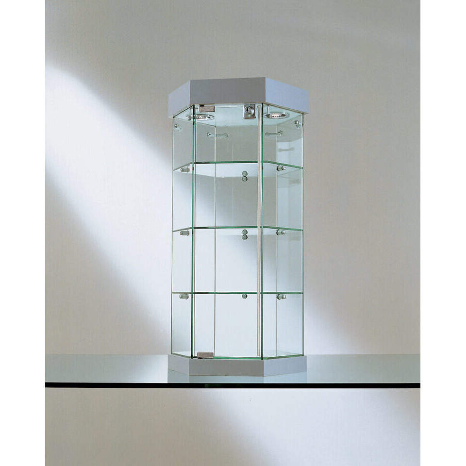 Vitrine de comptoir hexagonale 75 cm H 40 cm L en verre trempé gris clair avec 3 étagères et porte verrouillable