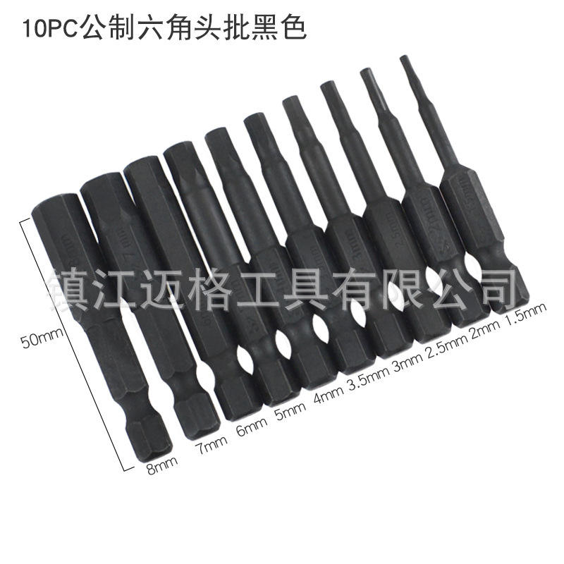 10PC Metric Hex Screwdriver Bits, Black, 50mm