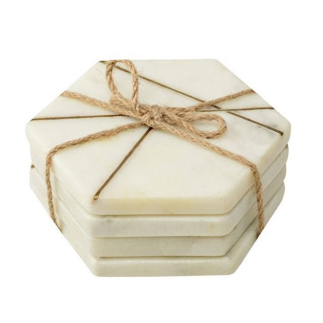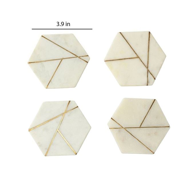 Incrustation en laiton hexagonal marbre or blanc taille personnalisée pierre de marbre de luxe et incrustation en métal sous-verre pour thé ou café sous-verre en pierre
