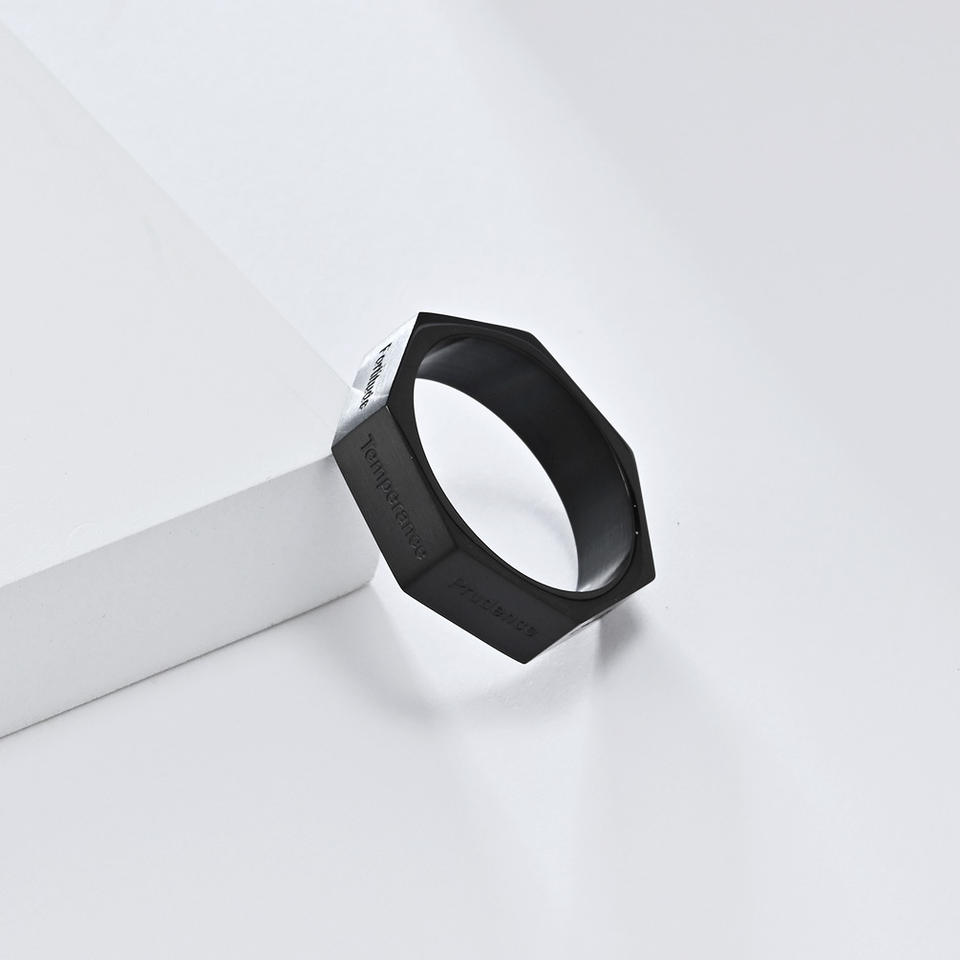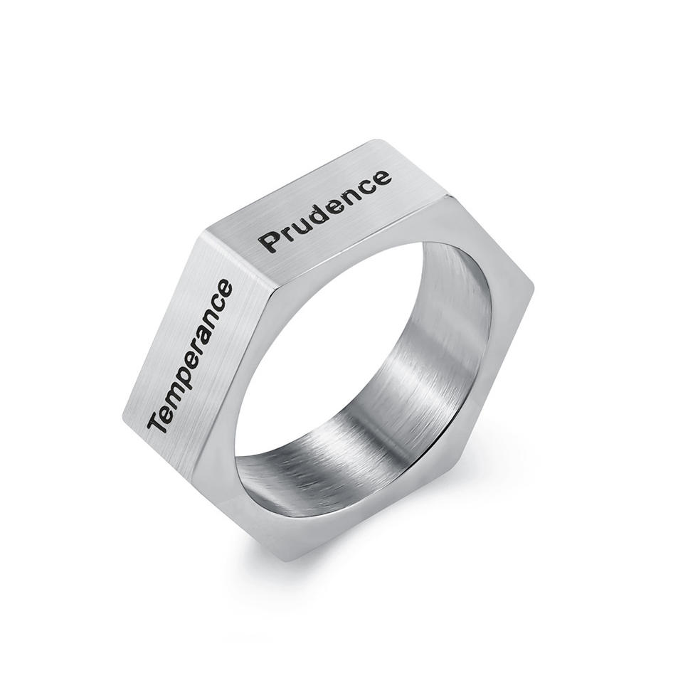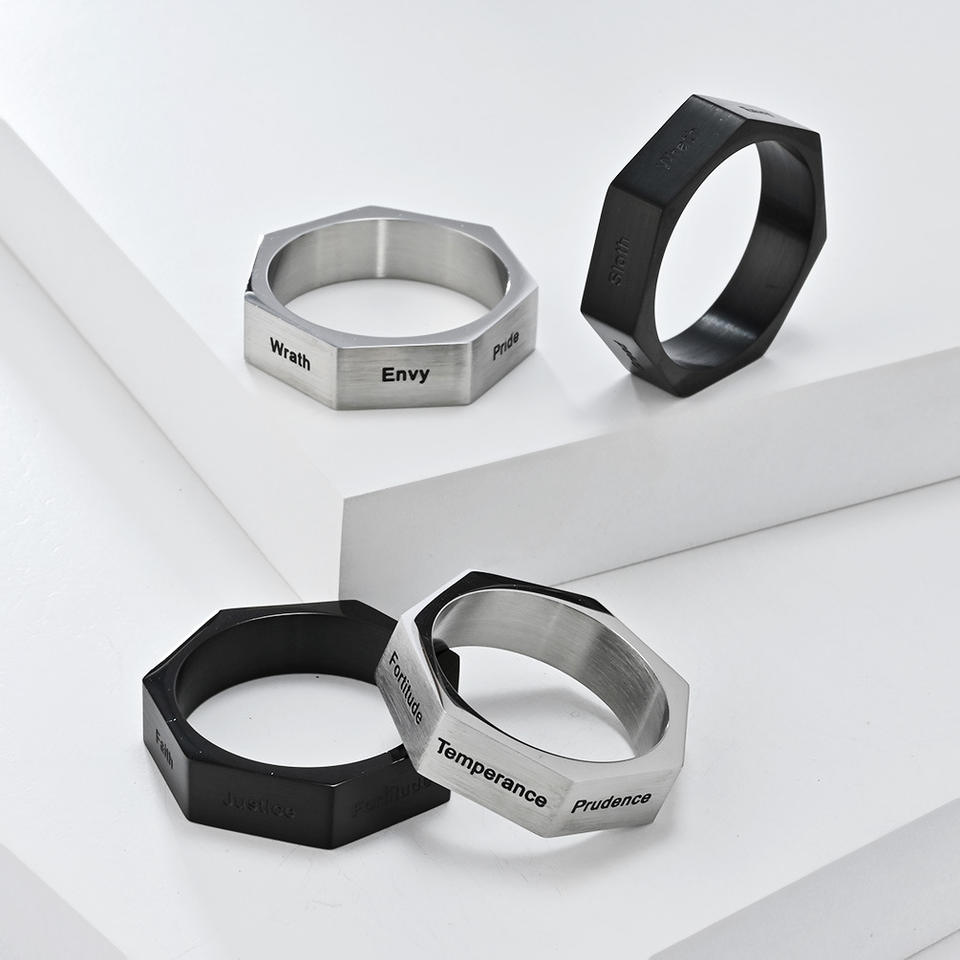 Bague hexagonale en acier titane, sept péchés capitaux et vertus gravées, bijoux de mode unisexe, cadeau