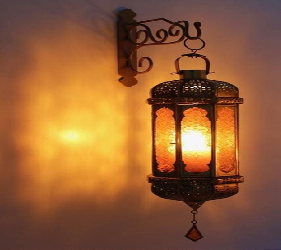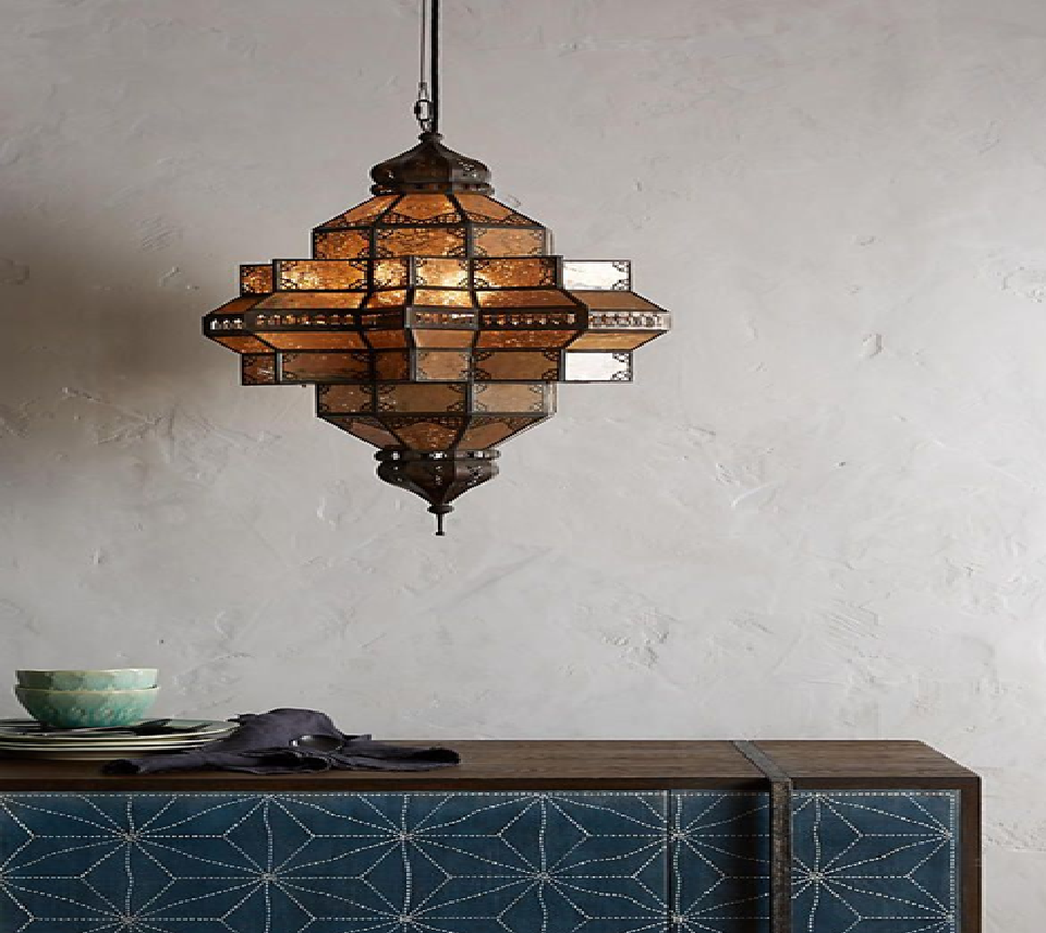 Lanterne suspendue hexagonale avec verre à motifs bleu vif, ajoutant des couleurs et des ombres mystiques
