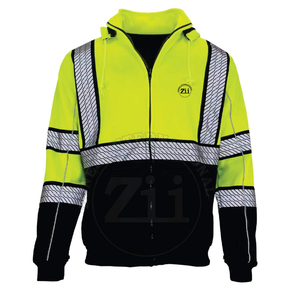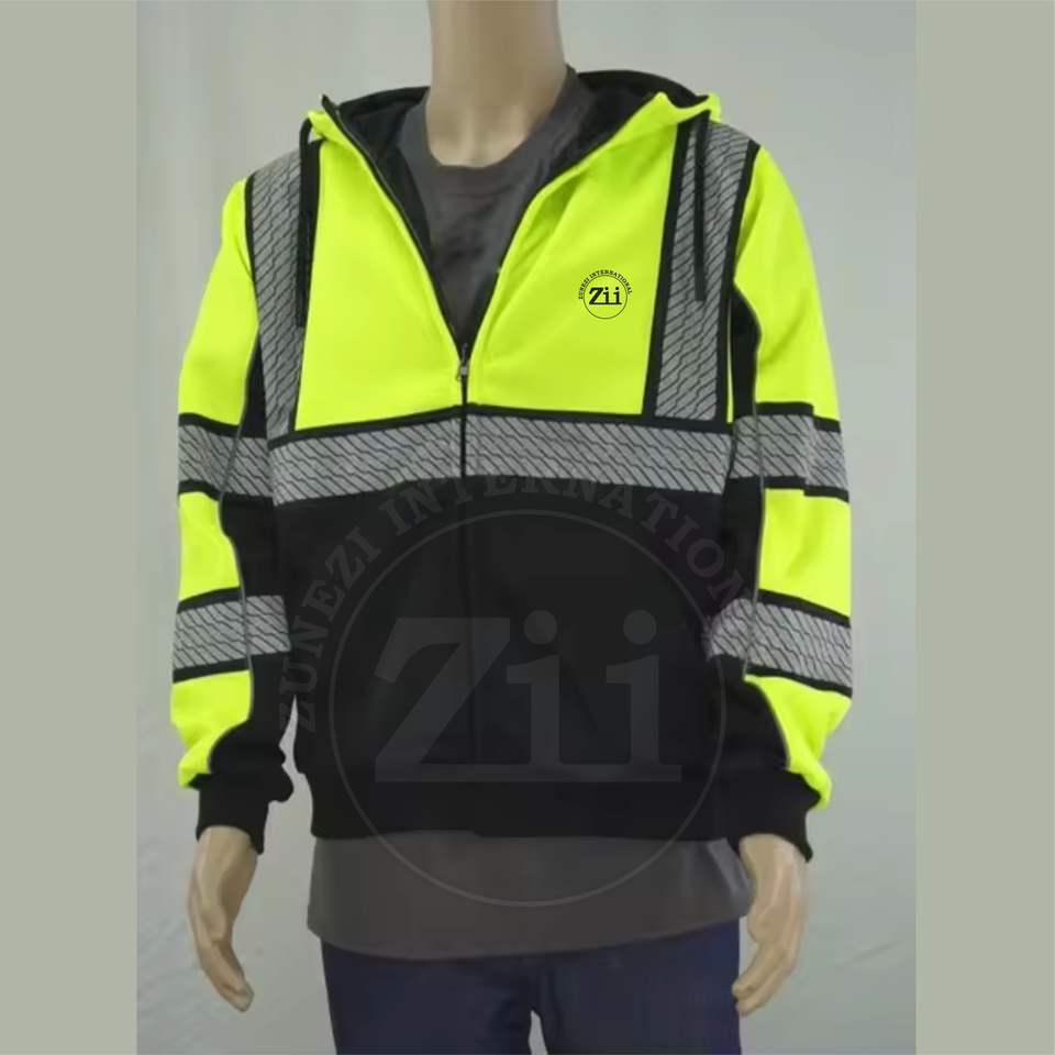 Sweat à capuche réfléchissant de sécurité unisexe haute visibilité ANSI Classe 2, fermeture éclair intégrale, polyester et coton, avec bande réfléchissante de style gilet
