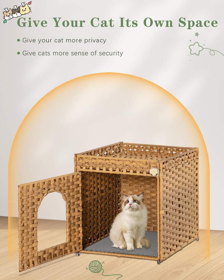 Litière pour chat dissimulée avec tapis et clôture, maison pour chat en rotin tressé à la main avec deux crochets en forme de S pour salon, chambre à coucher 18,5x20,5x19,1 pouces