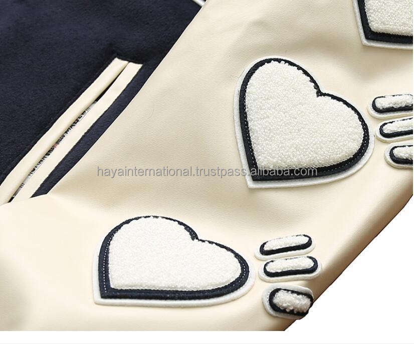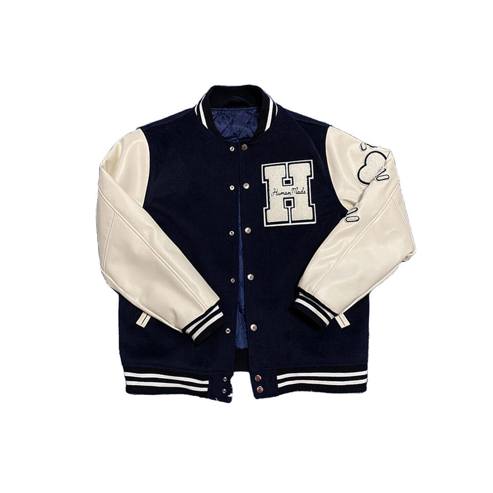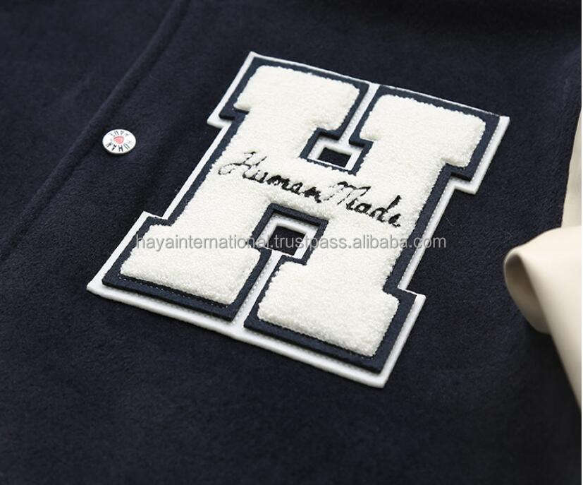 Veste universitaire de haute qualité pour homme avec broderie alphabétique, 100% laine, manches en cuir véritable, col montant, poche poitrine, hiver