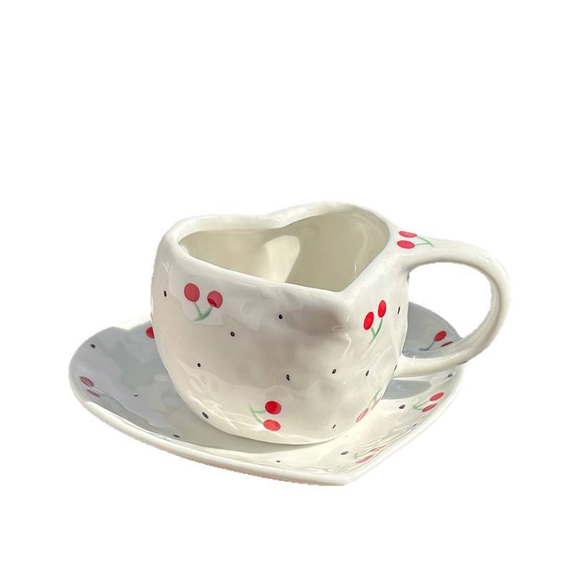 Ensemble tasse et soucoupe à café en céramique peinte à la main, en forme de cœur, faite à la main, motif cerise, design élégant