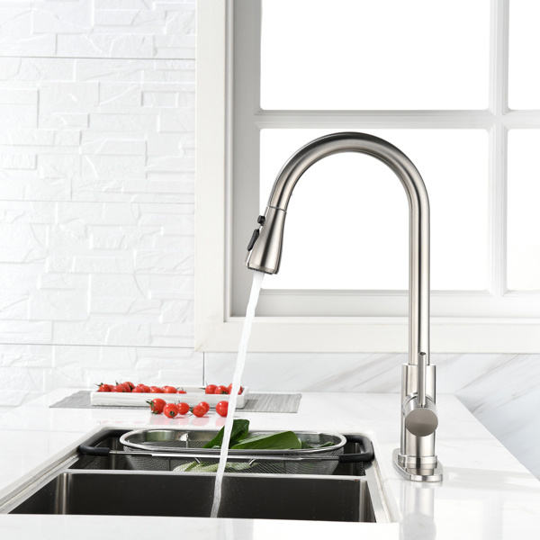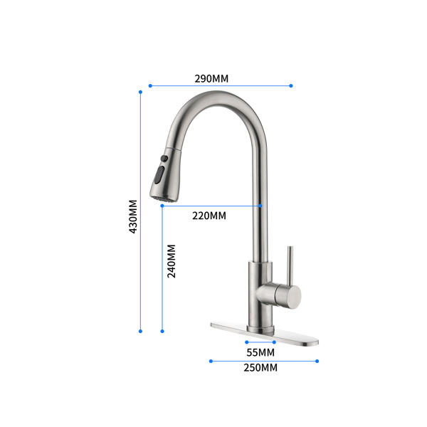 Robinet de cuisine monocommande à arc haut en acier inoxydable avec douchette extractible, design moderne, installation monotrou