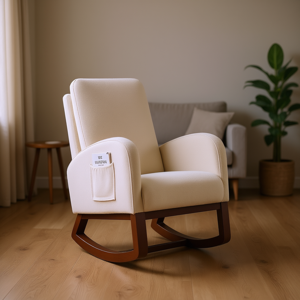 Fauteuil à bascule en flanelle beige à dossier haut avec pieds marron, fauteuil de salon avec poche latérale