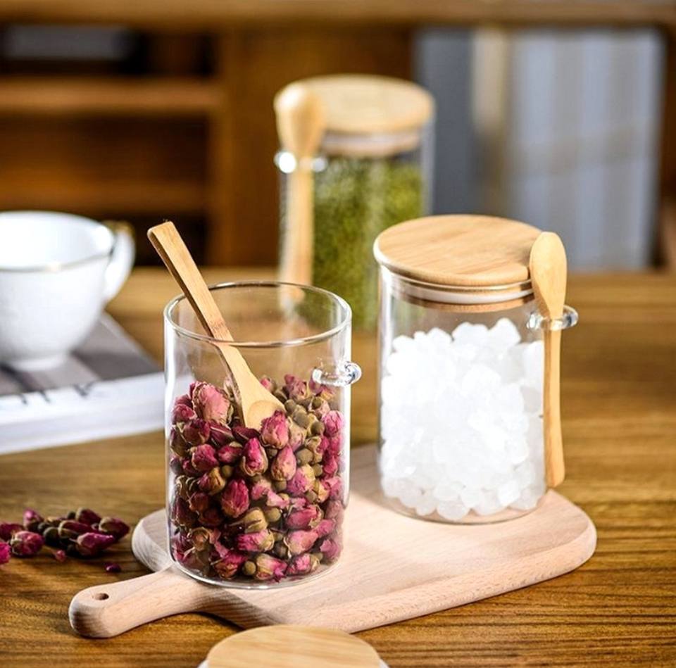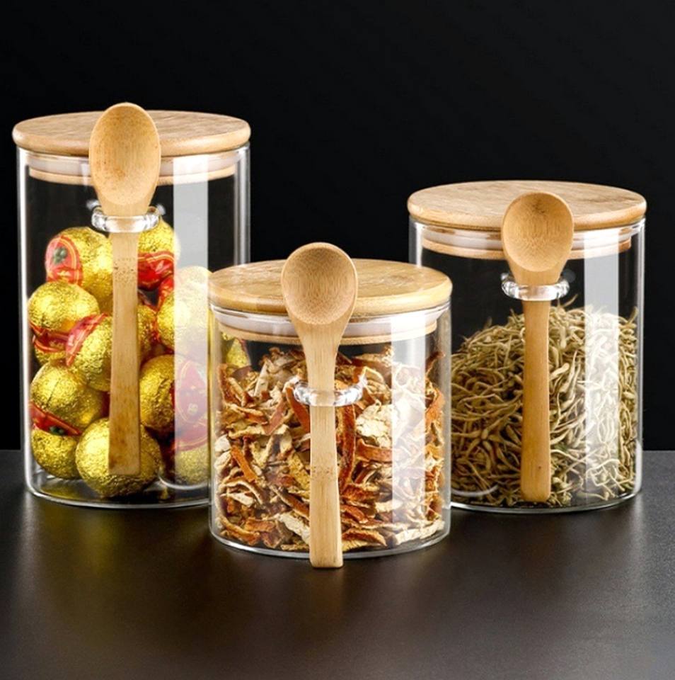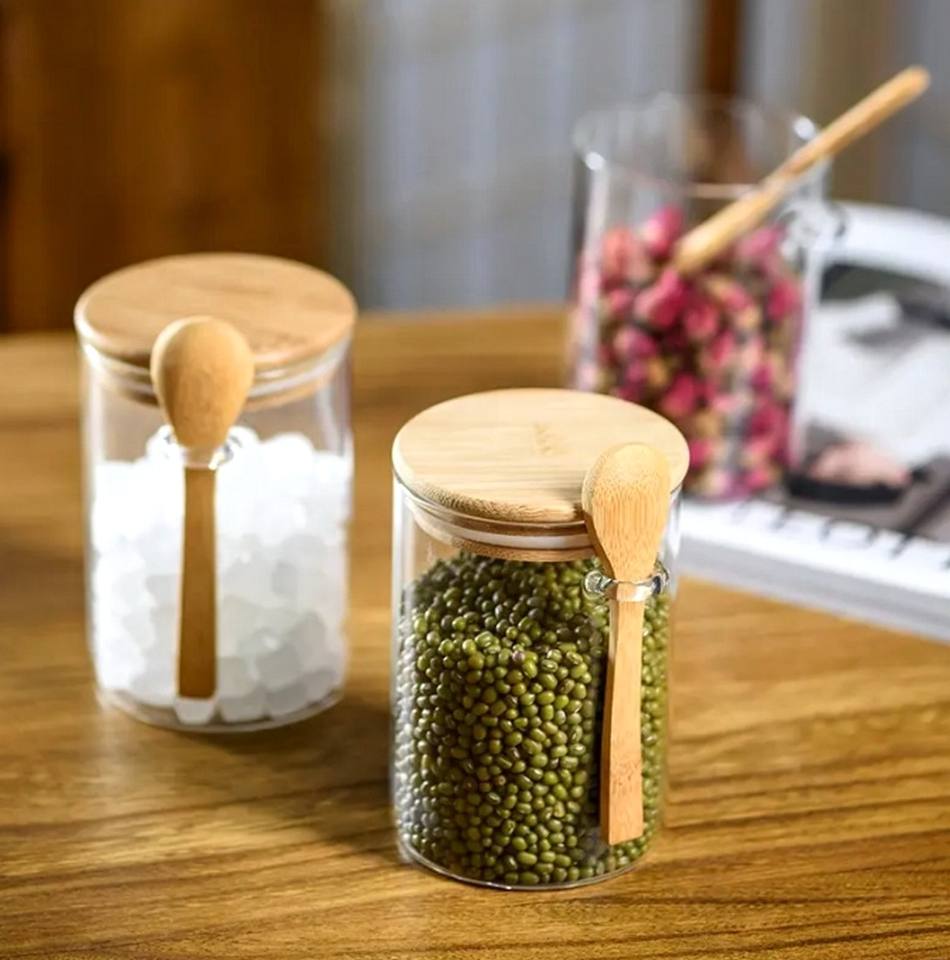 Pot de conservation en verre borosilicate de qualité alimentaire pour épices et céréales, avec cuillère en bois classique, résistant à la chaleur pour la cuisine