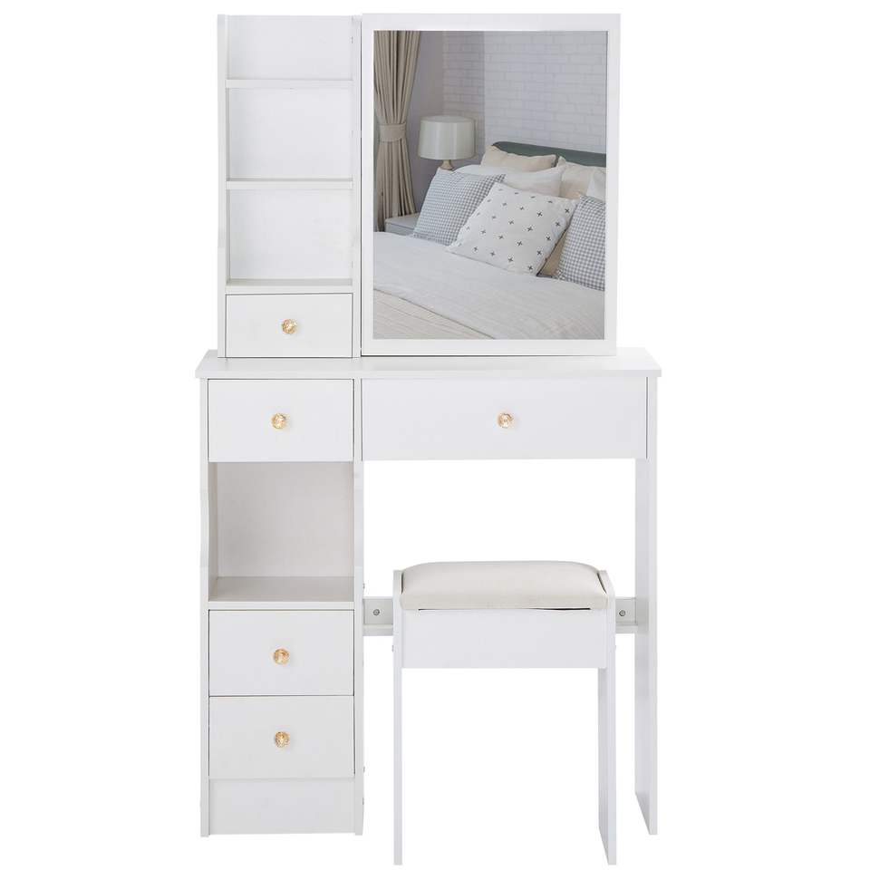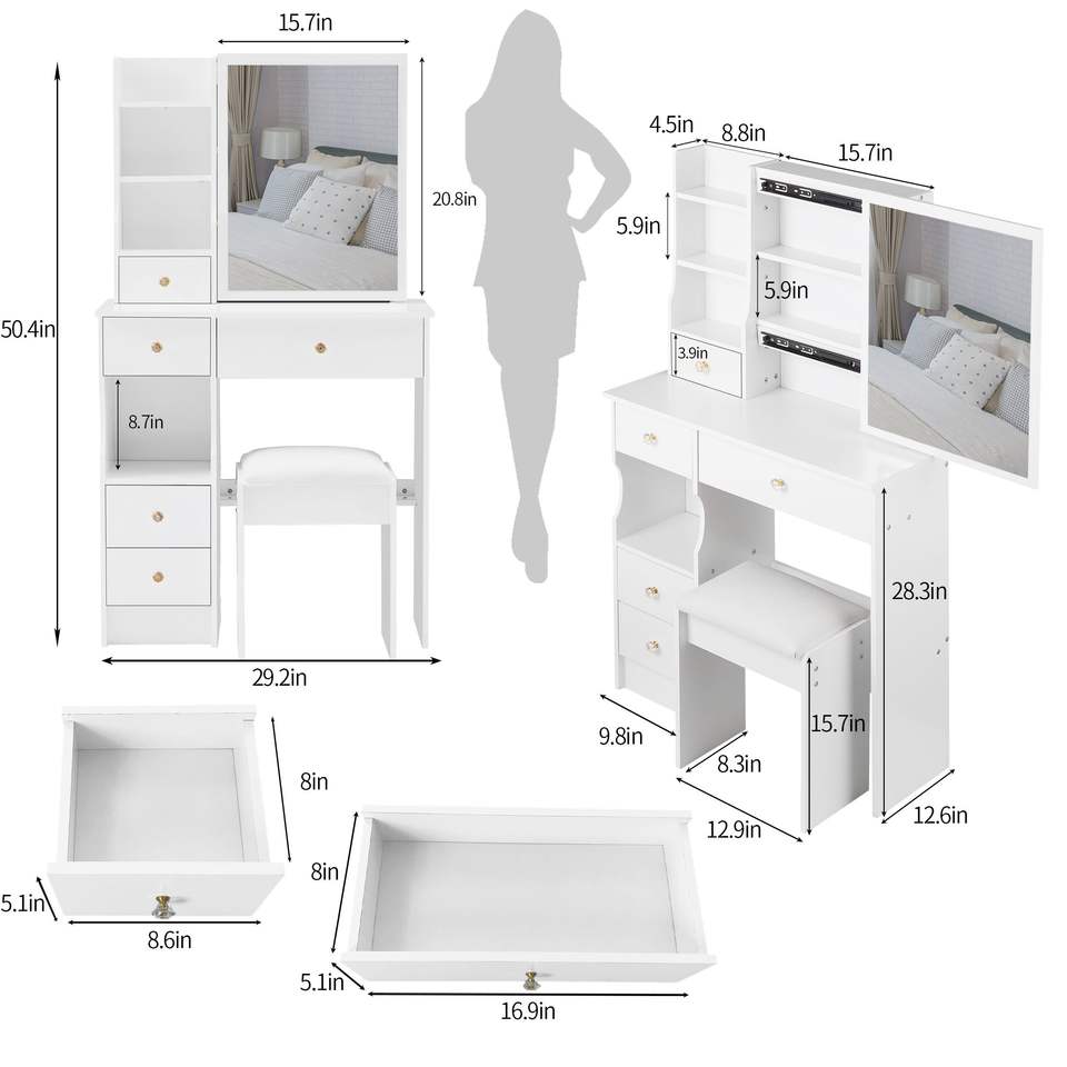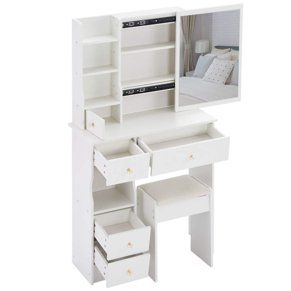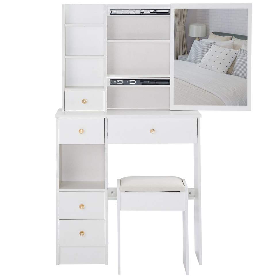 Table de maquillage de bureau à grande capacité avec tabouret rembourré, miroir coulissant extra large et petit tiroir gauche