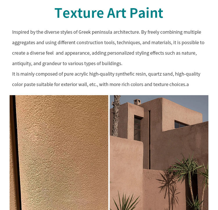 Caractéristique:Texture stuc, couleurs personnalisables, haute couvrance, aspect artistique de façade, etc.