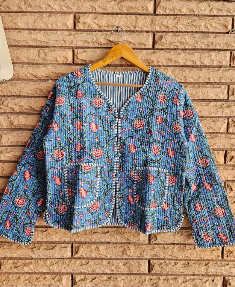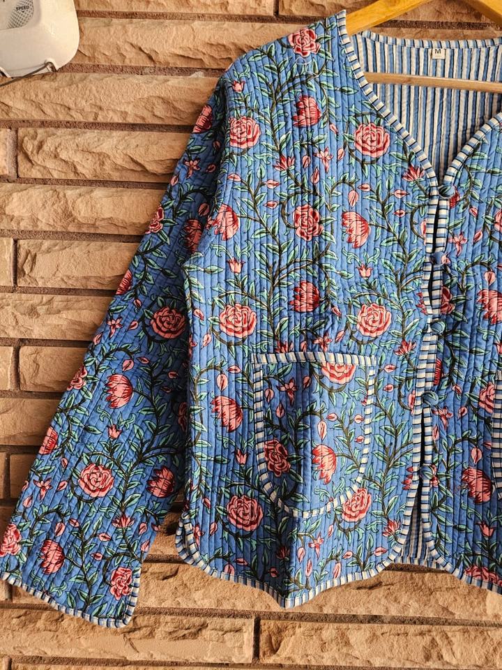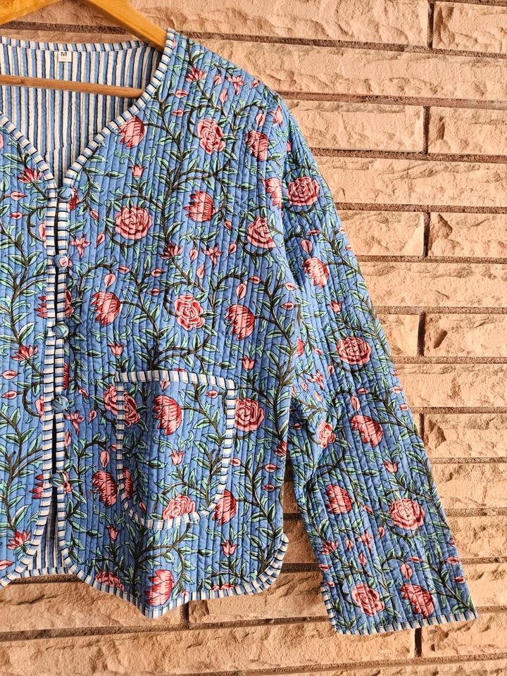 High Custom Hand Block Printed Blue Floral Quilted Cotton Coat Lightweight Quilted Ethnic with Button Front for Women Stylish