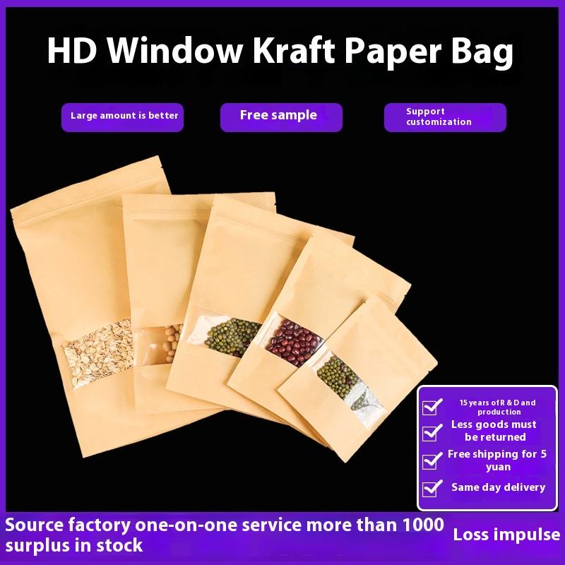 Sac en papier Kraft Ziplock transparent à fenêtre haute définition pour engrais de farine de haricots de thé de noix et emballage alimentaire