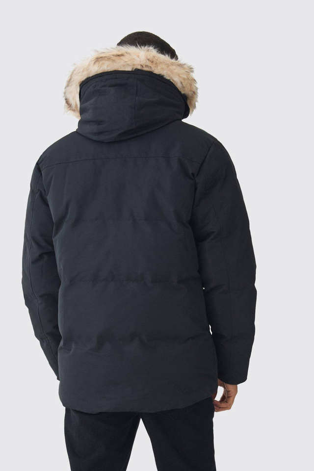 Blouson matelassé à capuche très demandé avec garniture en fausse fourrure amovible, noir, coupe-vent, chaud, pour homme, avec poches latérales