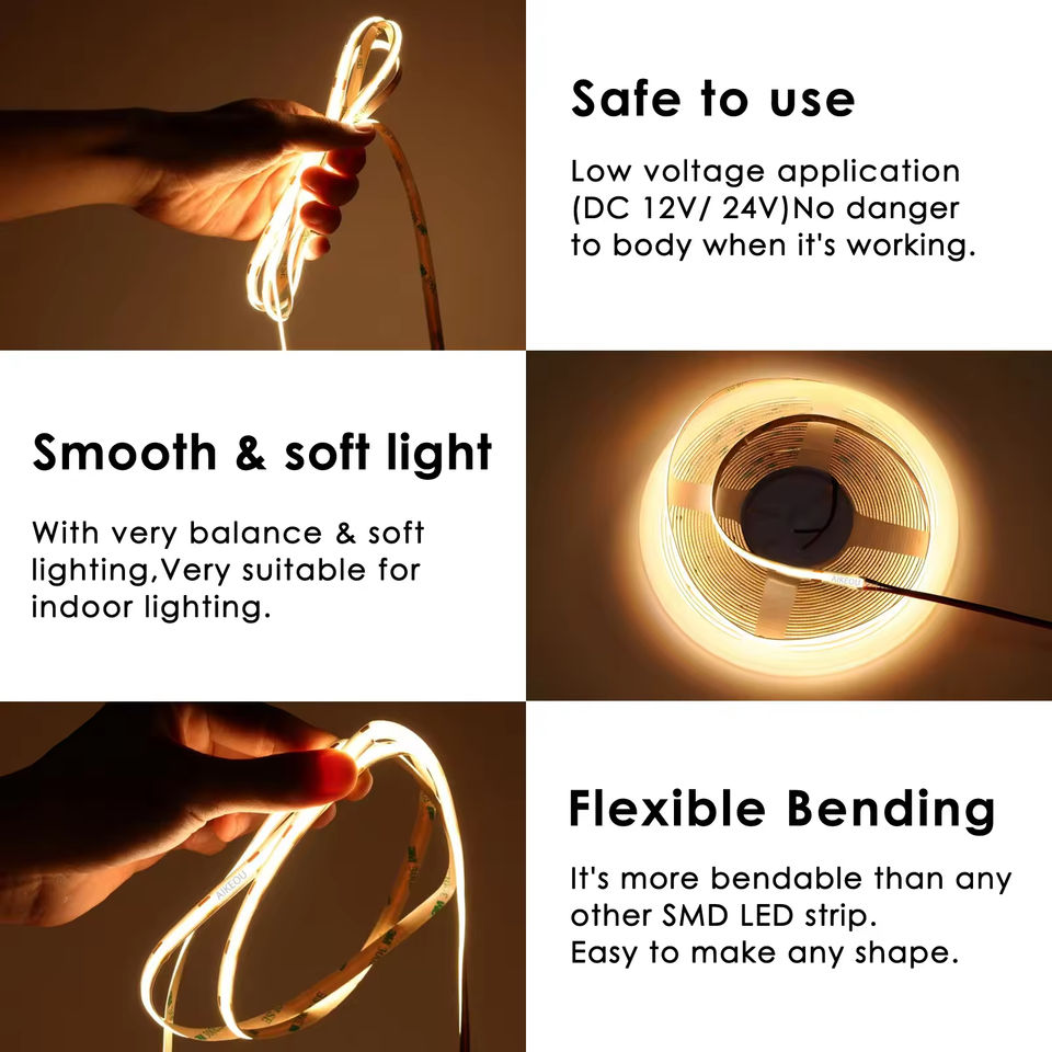 Bande LED COB flexible haute densité 480 LED/m 320 LED/m 10 W/m 8 mm 24 V, lumière uniforme pour décoration intérieure de chambre à coucher