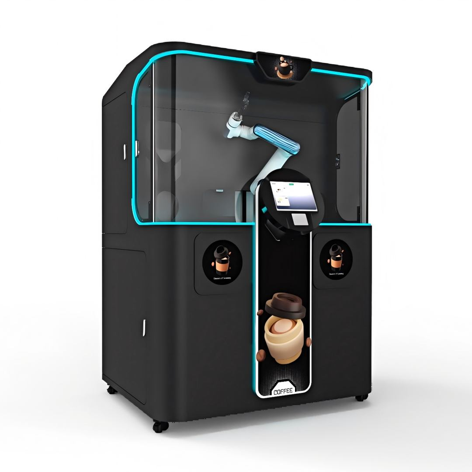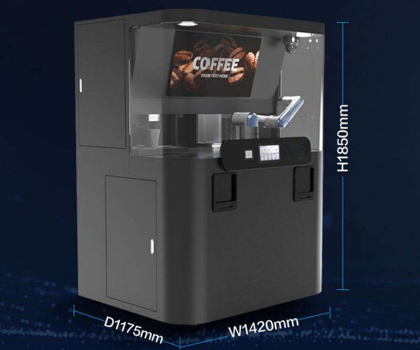 Machine à café expresso automatique robotisée IA haute performance avec bras barista robotisé et fonctionnement sans contact pour aéroports et centres commerciaux
