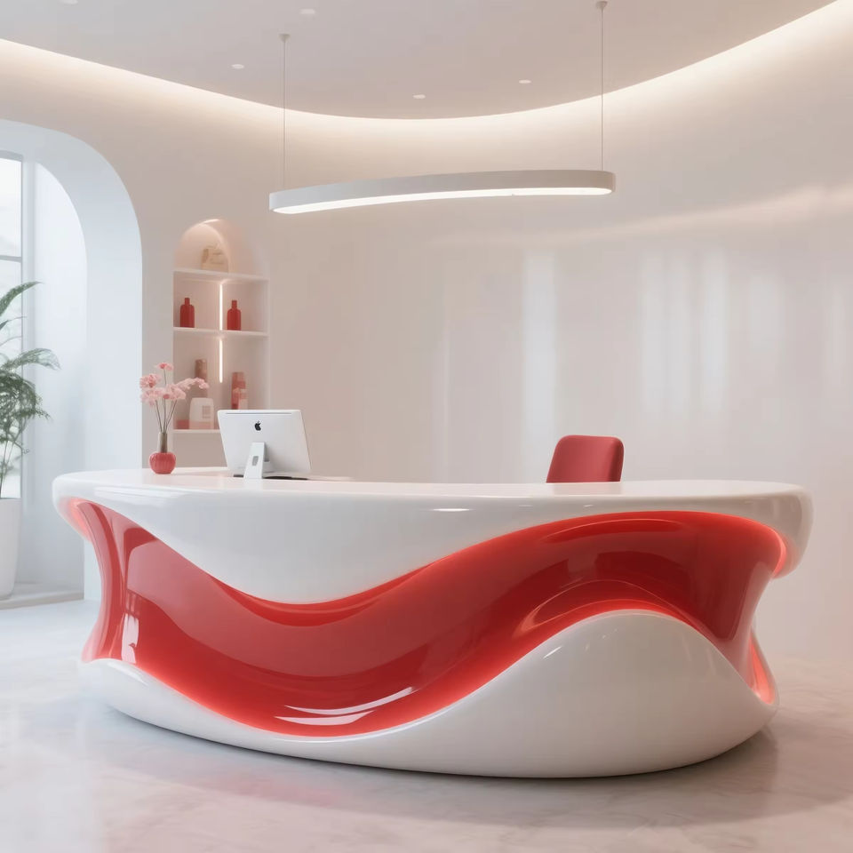 Comptoir de réception rouge imprimé en 3D haut de gamme, fabrication multicouche avancée pour des courbes de hall uniques