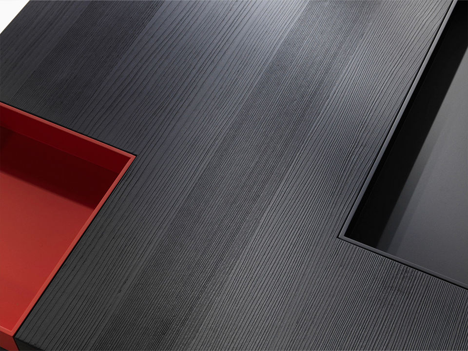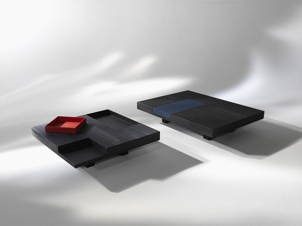 Table basse artistique haut de gamme avec plateaux amovibles et placage de bois texturé pour salons modernes
