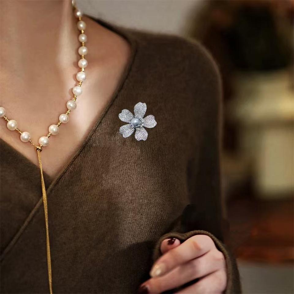Broche de mode haut de gamme pour femme, style chinois, en zircon blanc dégradé, motif fleur, en cuivre plaqué or, avec perle