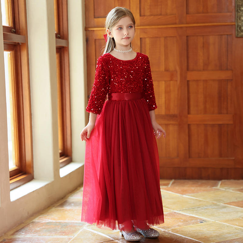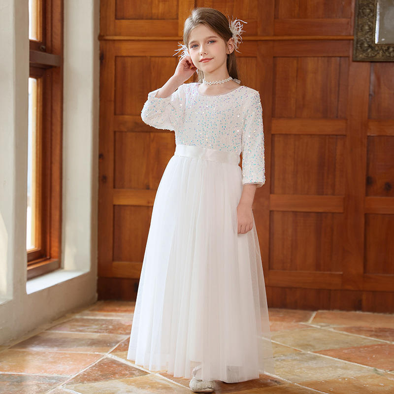 Robe de soirée haut de gamme personnalisée pour filles, grise, en tulle à sequins, longue, style princesse, pour spectacle, défilé ou récital de piano