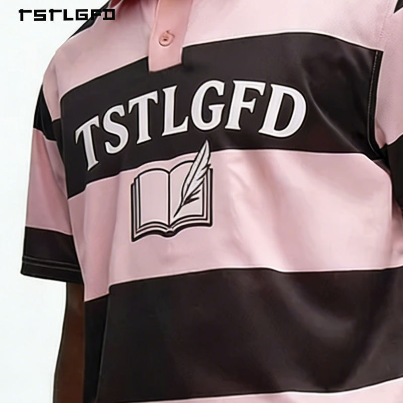 T-shirt à col polo imprimé numérique rayé rose vintage haut de gamme surdimensionné pour hommes, vêtements de rue pour hommes