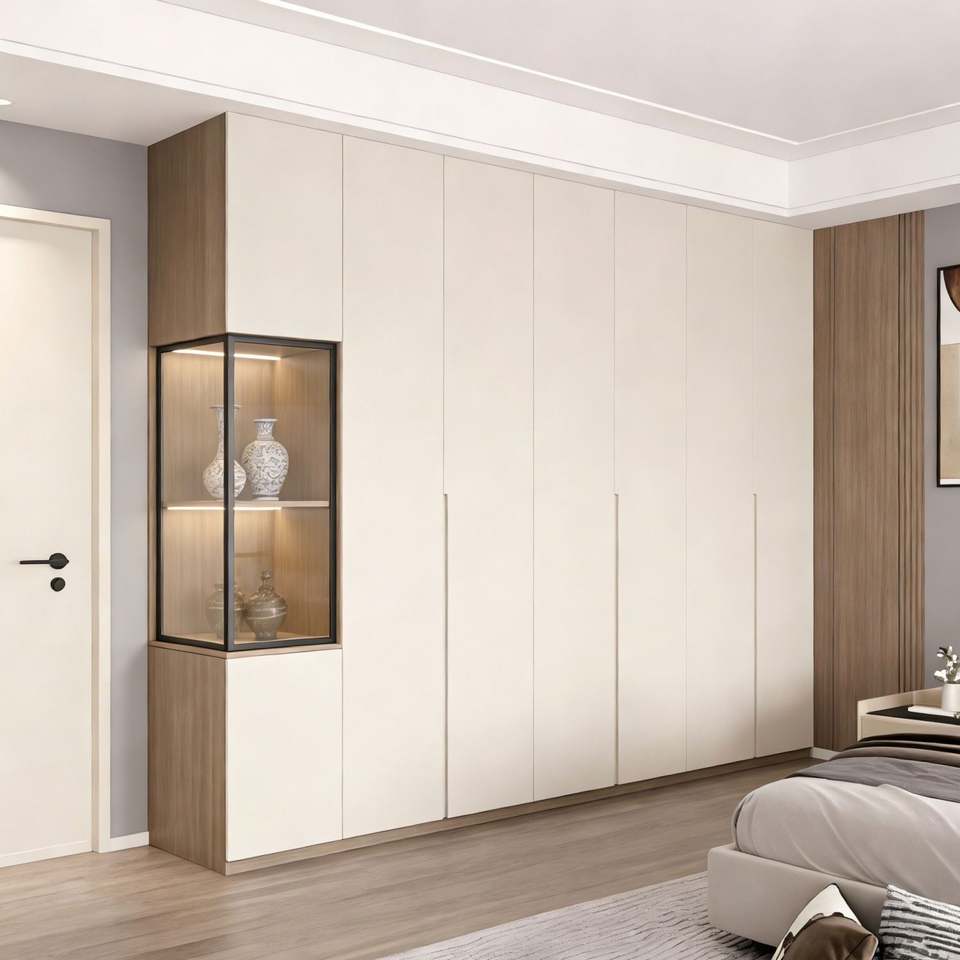 Armoire de chambre à coucher sur mesure haut de gamme, panneau texturé et niche intégrée, placard en bois avec miroir et banc de rangement