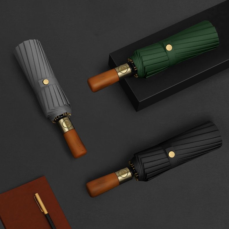 Cadeau haut de gamme parapluie automatique 3 plis avec manche en bois coupe-vent grand logo imprimé parapluie pliant d'affaires pour hommes pour la pluie