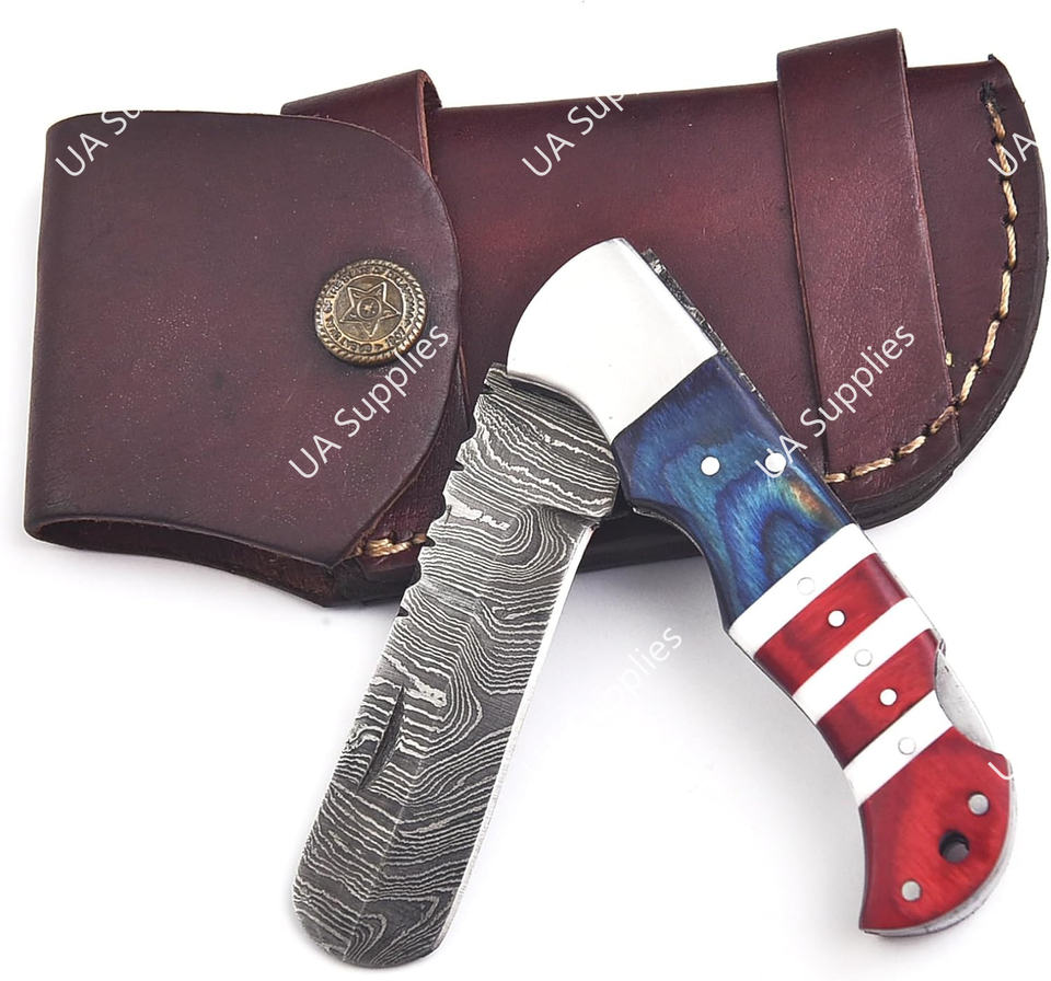 Couteau pliant haut de gamme artisanal en acier Damas, pointe tombante, manche en bois Pakka et résine patriotique, pommelle en acier inoxydable, étui en cuir, EDC