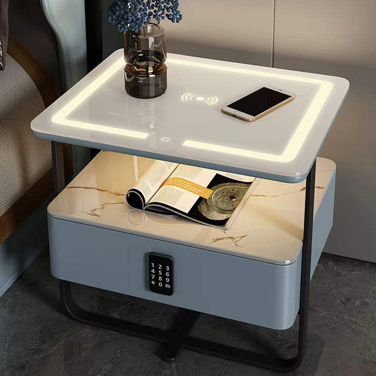 Meuble de maison haut de gamme, table d'appoint intelligente, plateau en céramique frittée, table de chevet avec serrure à empreintes digitales et éclairage LED décoratif.
