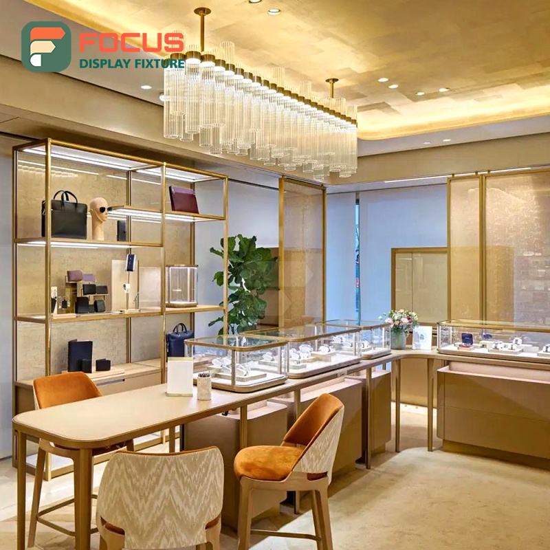 Vitrine de bijouterie en bois avec éclairage LED haut de gamme, design moderne et luxueux pour l'aménagement intérieur d'une boutique de bijoux