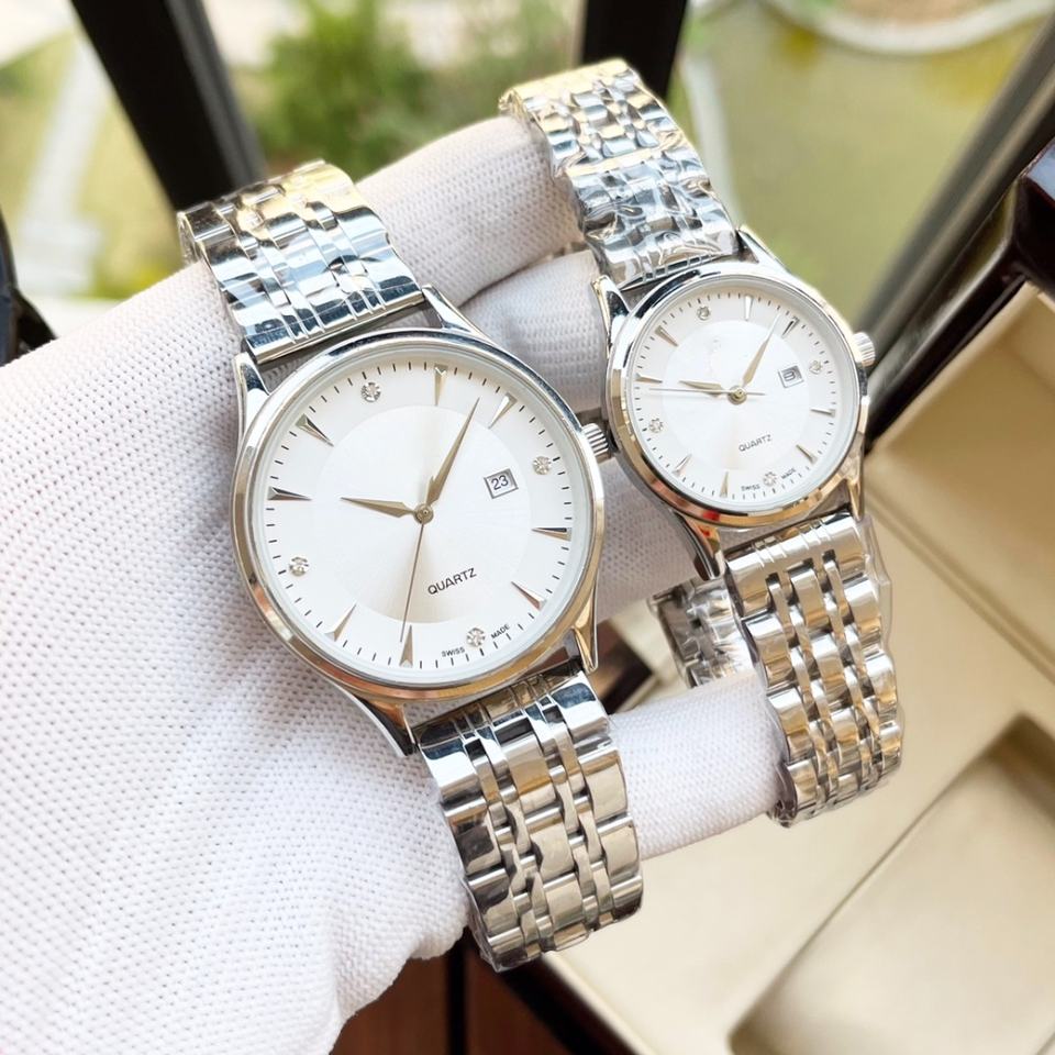 Montres mécaniques pour couple, acier inoxydable argenté avec cadran blanc, affichage de la date et accents de diamants Omegaes