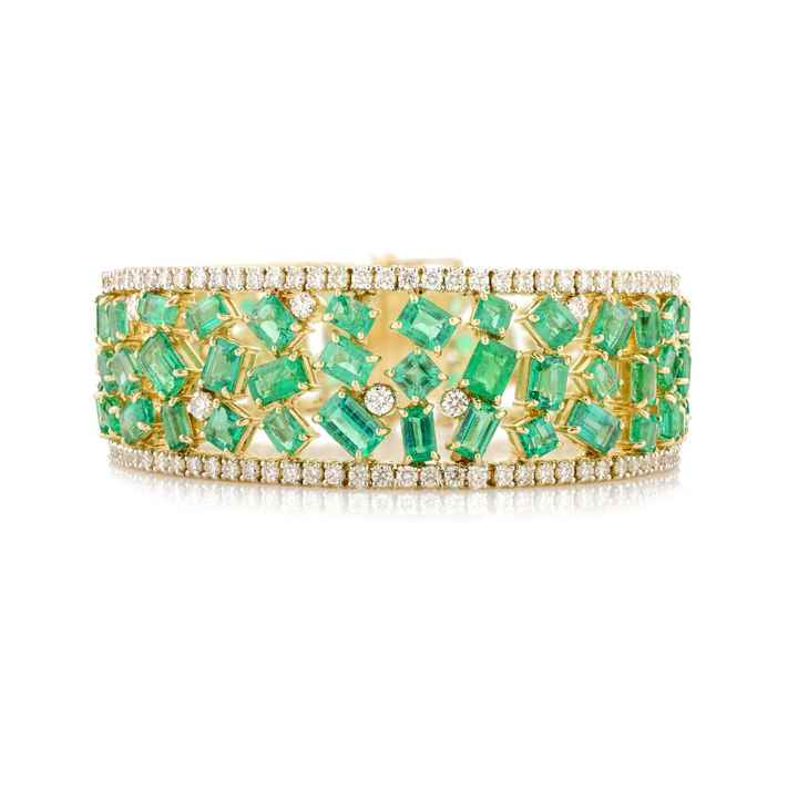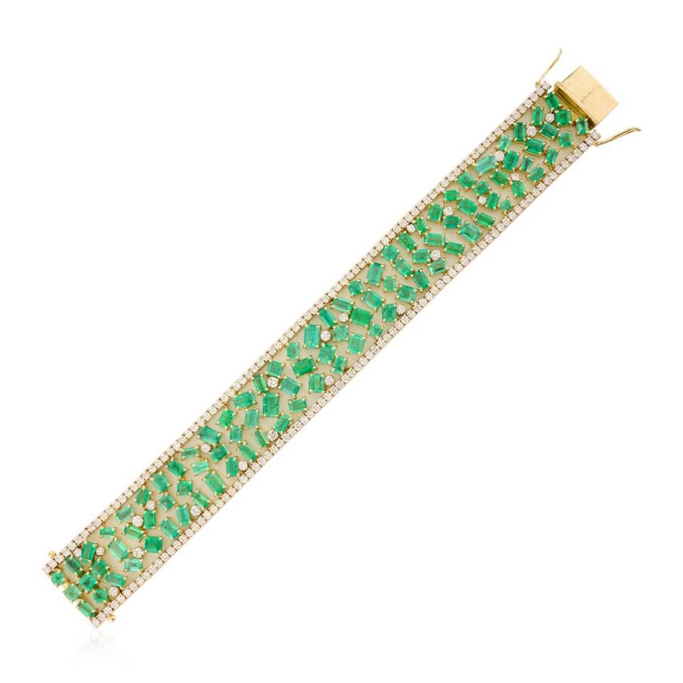Bracelet de cocktail large en émeraude naturelle et diamant fait main de luxe haut de gamme avec des bijoux en gros en or jaune massif 18 carats