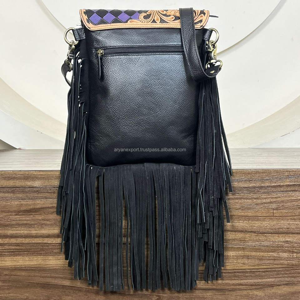 Product name:Hand Tooled Leather Fringe Checkered Crossbody Bag
