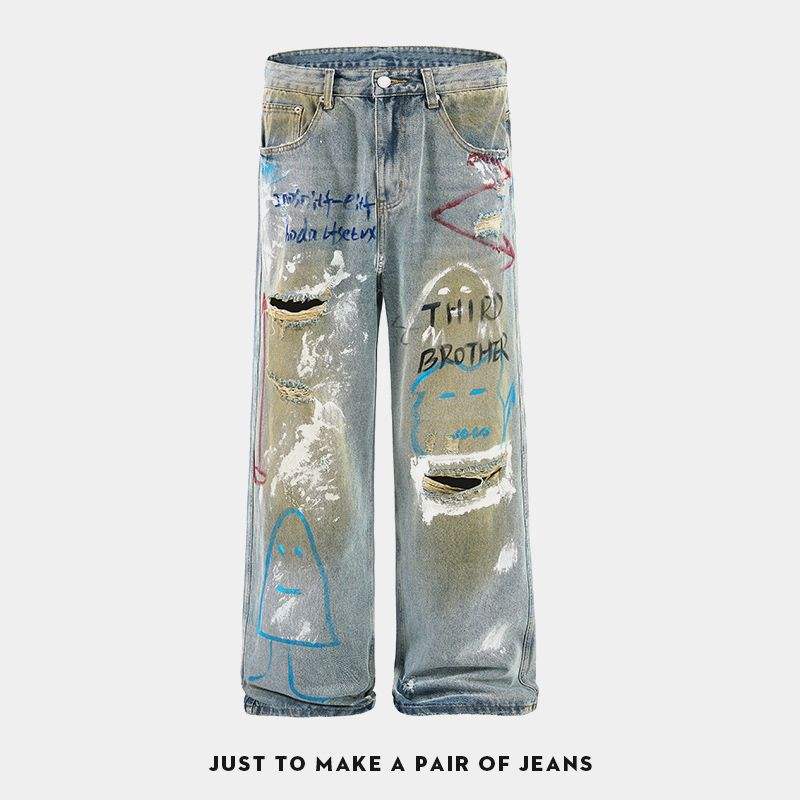 Haut de gamme hommes 100% coton jambe droite jean léger nouveau Style de rue américain Ruffian trous peints taille moyenne jambe large