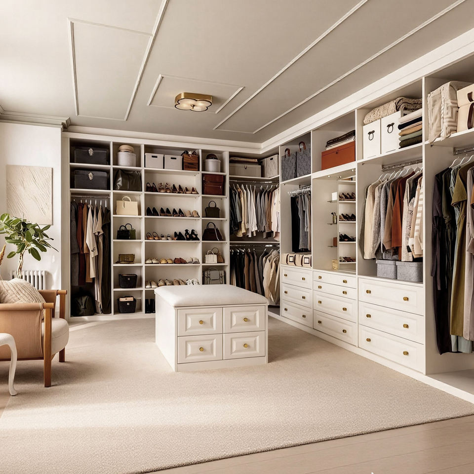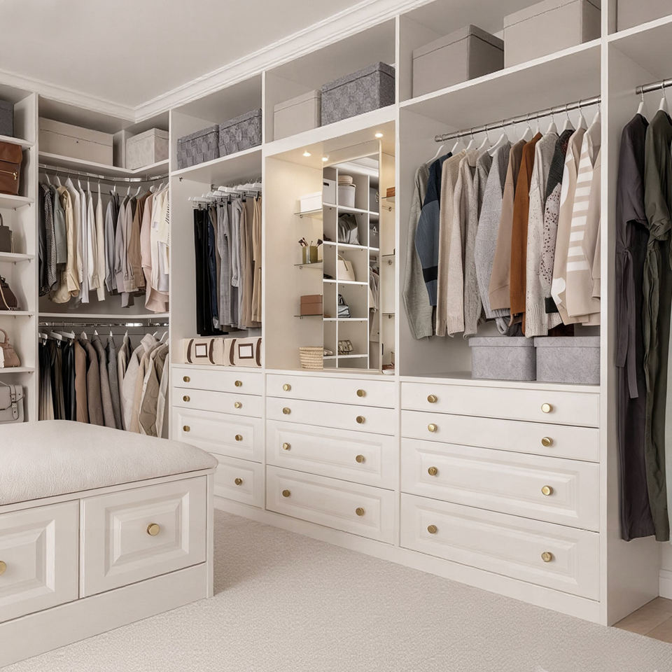 Systèmes d'Organisation de Placard en Contreplaqué Nouveau Design, Haut de Gamme, Style Moderne, Finition Mélaminée, pour Projets d'Aménagement de Dressings Ouverts