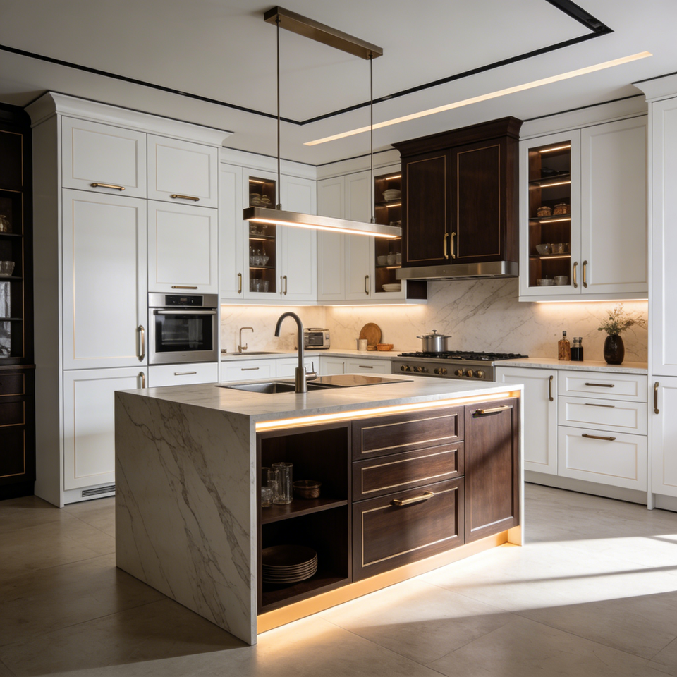 Meuble de cuisine haut de gamme bicolore avec tiroirs à fermeture amortie, plaque de cuisson encastrée et comptoirs en marbre