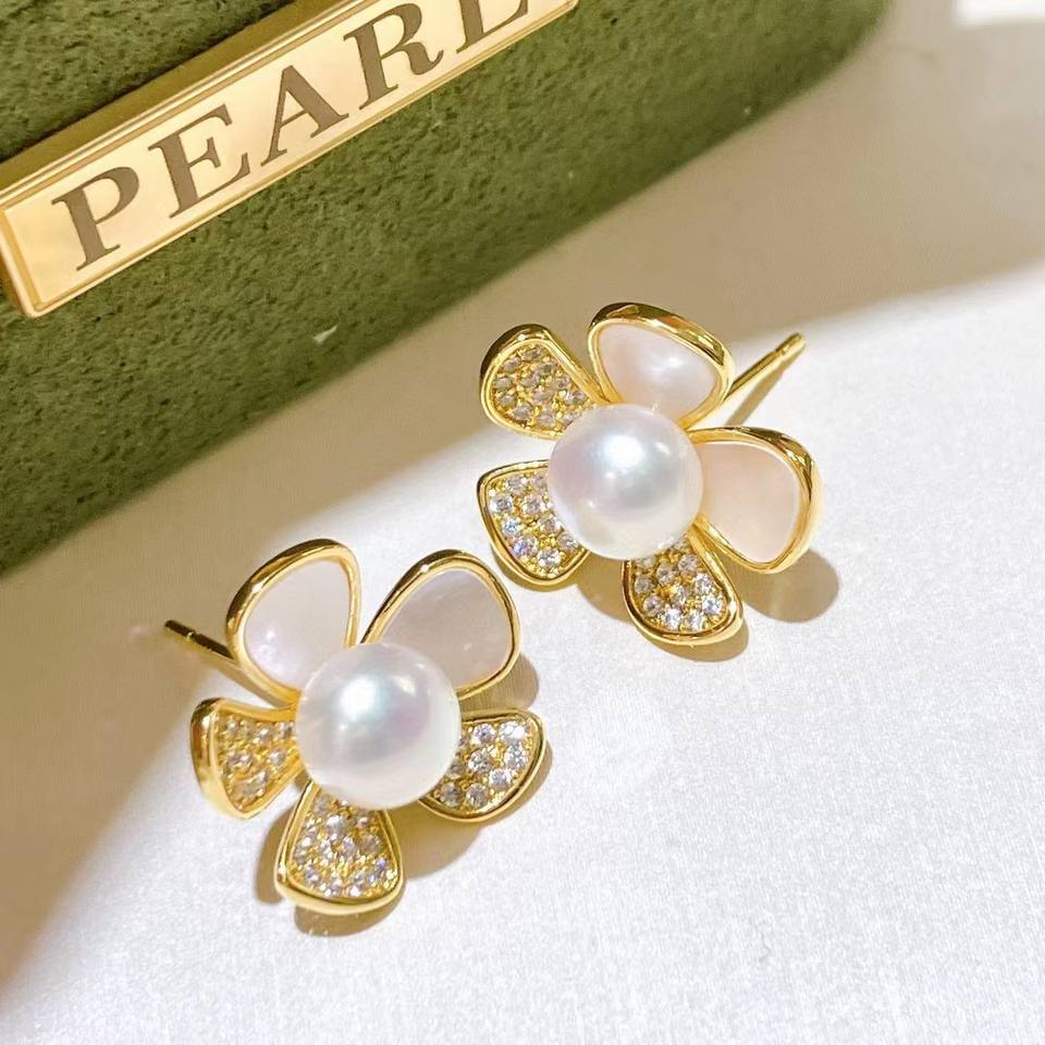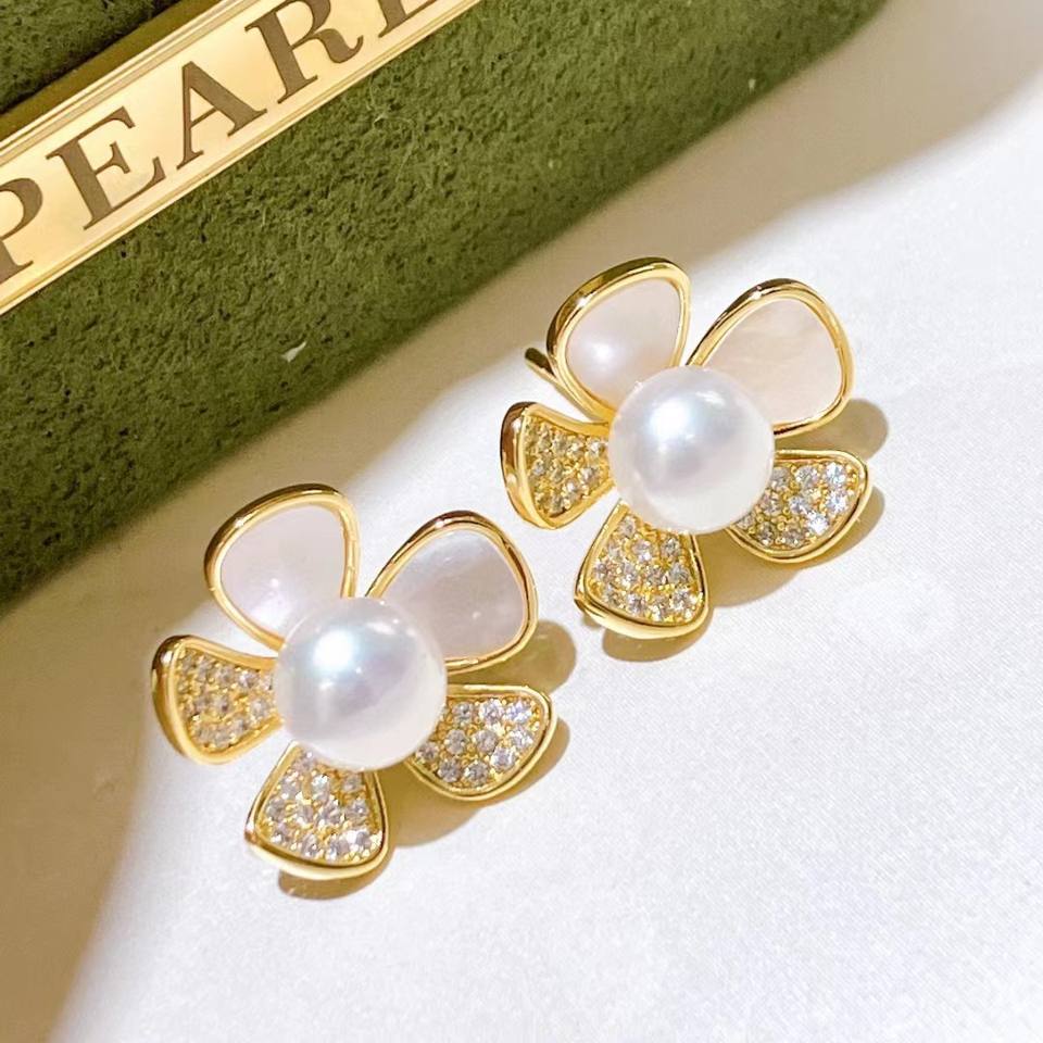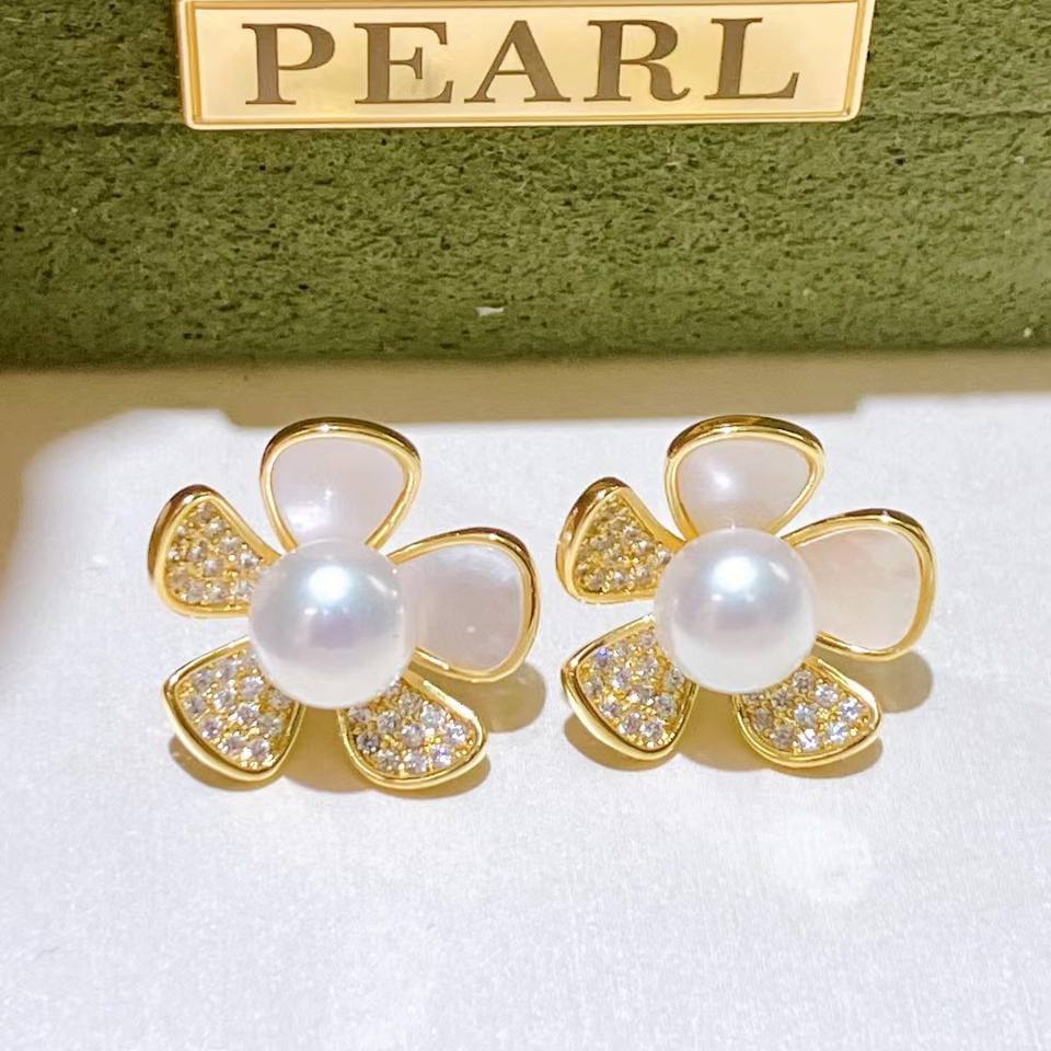 Boucles d'oreilles fleuries polyvalentes haut de gamme avec incrustation de nacre, boucles d'oreilles en or 14 carats, camélia, boucles d'oreilles en perles d'eau douce de Zhuji incrustées