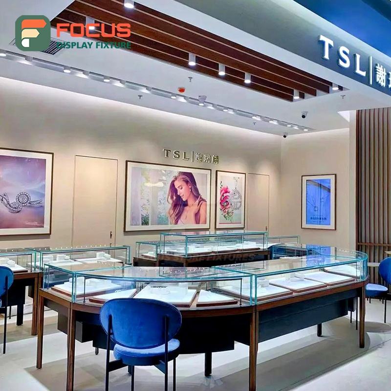 Vitrine de présentation de bijoux en bois haut de gamme avec éclairage LED moderne pour boutique de bijoux