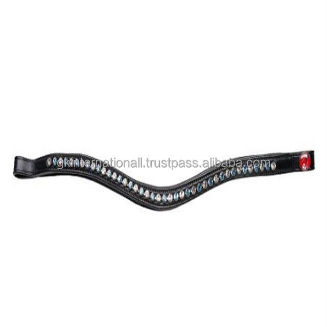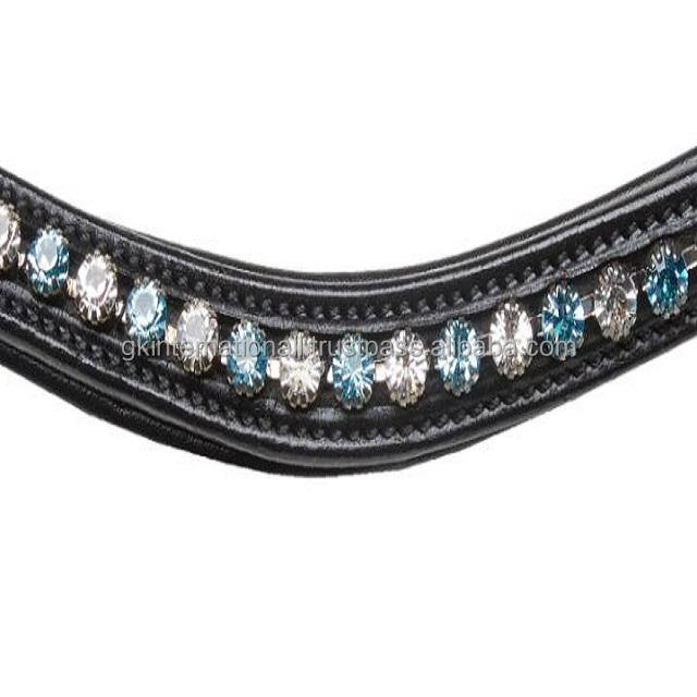 Bande de front de cheval rembourrée en cuir de selle épais haute finition en taille épi avec cristaux de marque multicolores incrustés de bande de front bling
