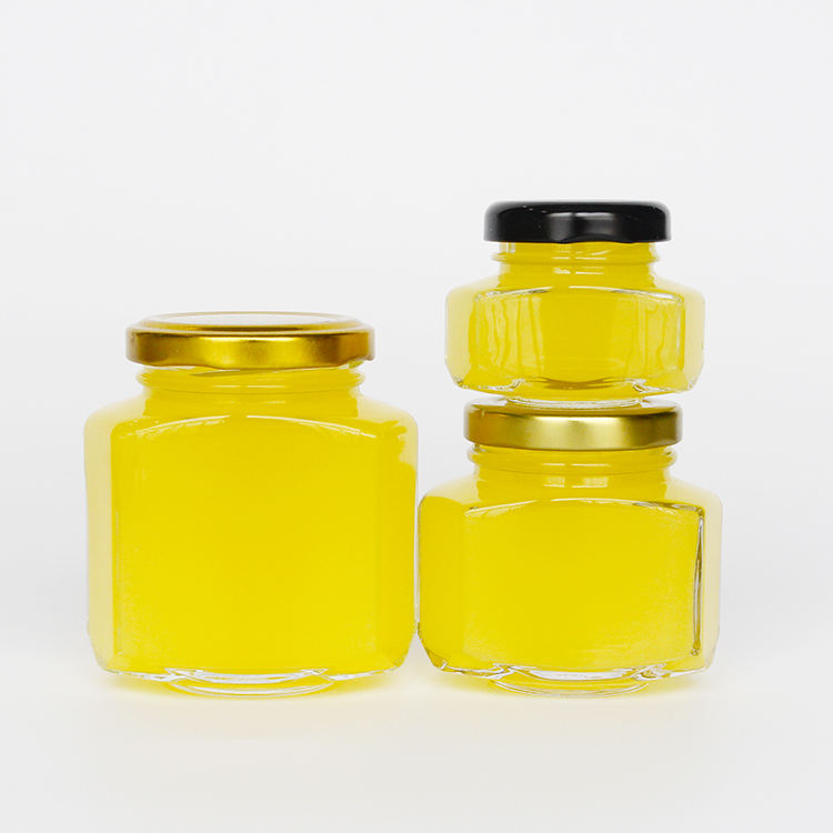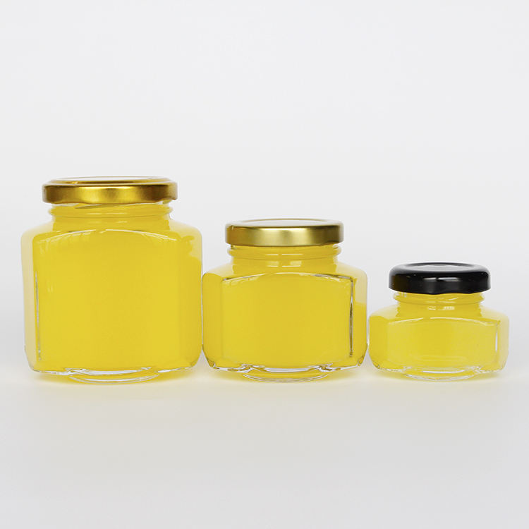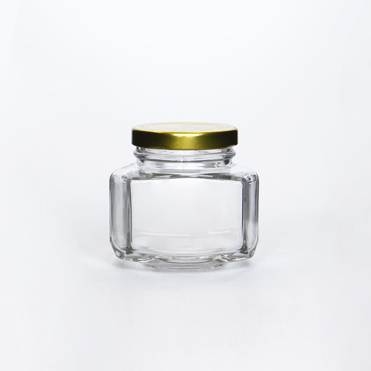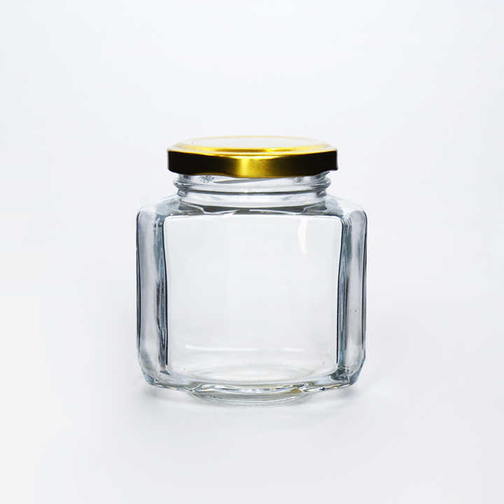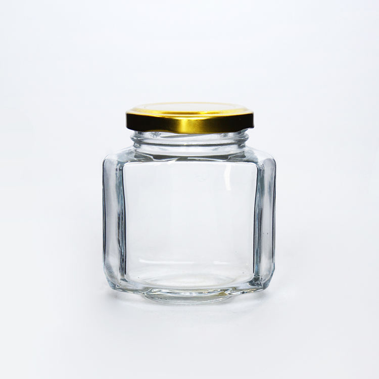 Nom du produit:Bocal de nourriture ovale en verre hexagonal avec capuchon en métal doré