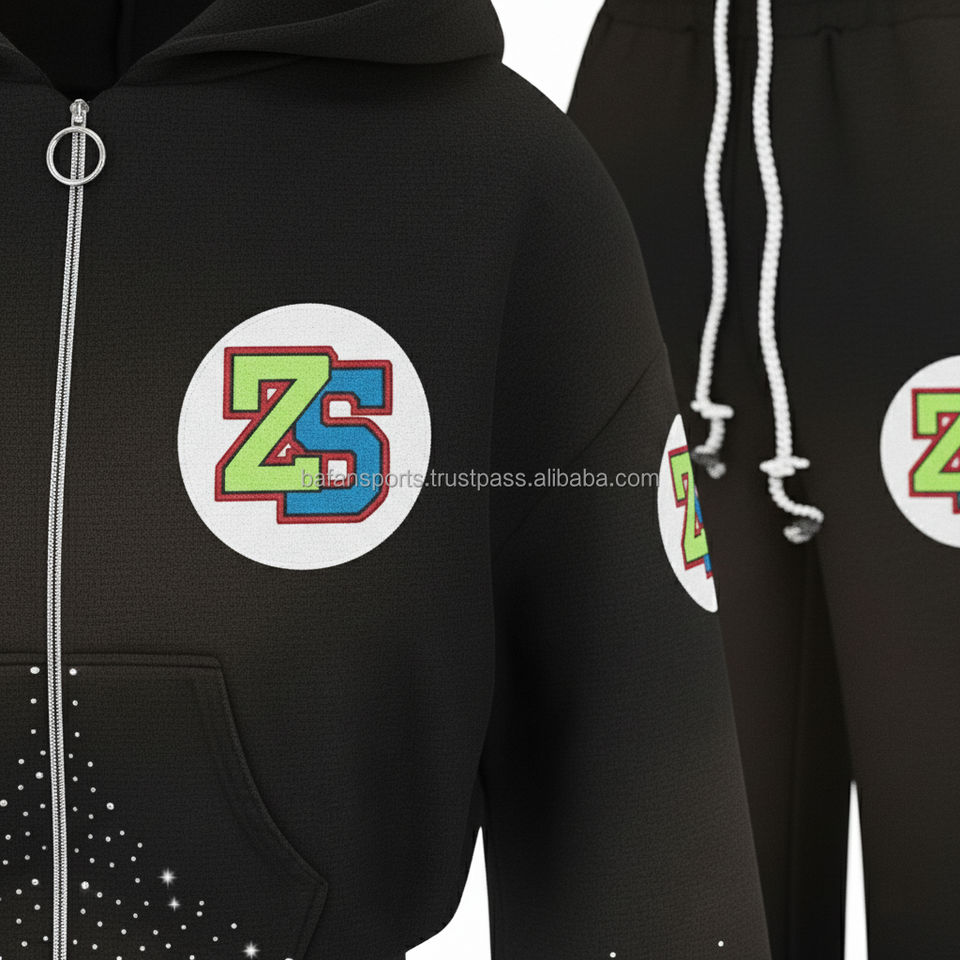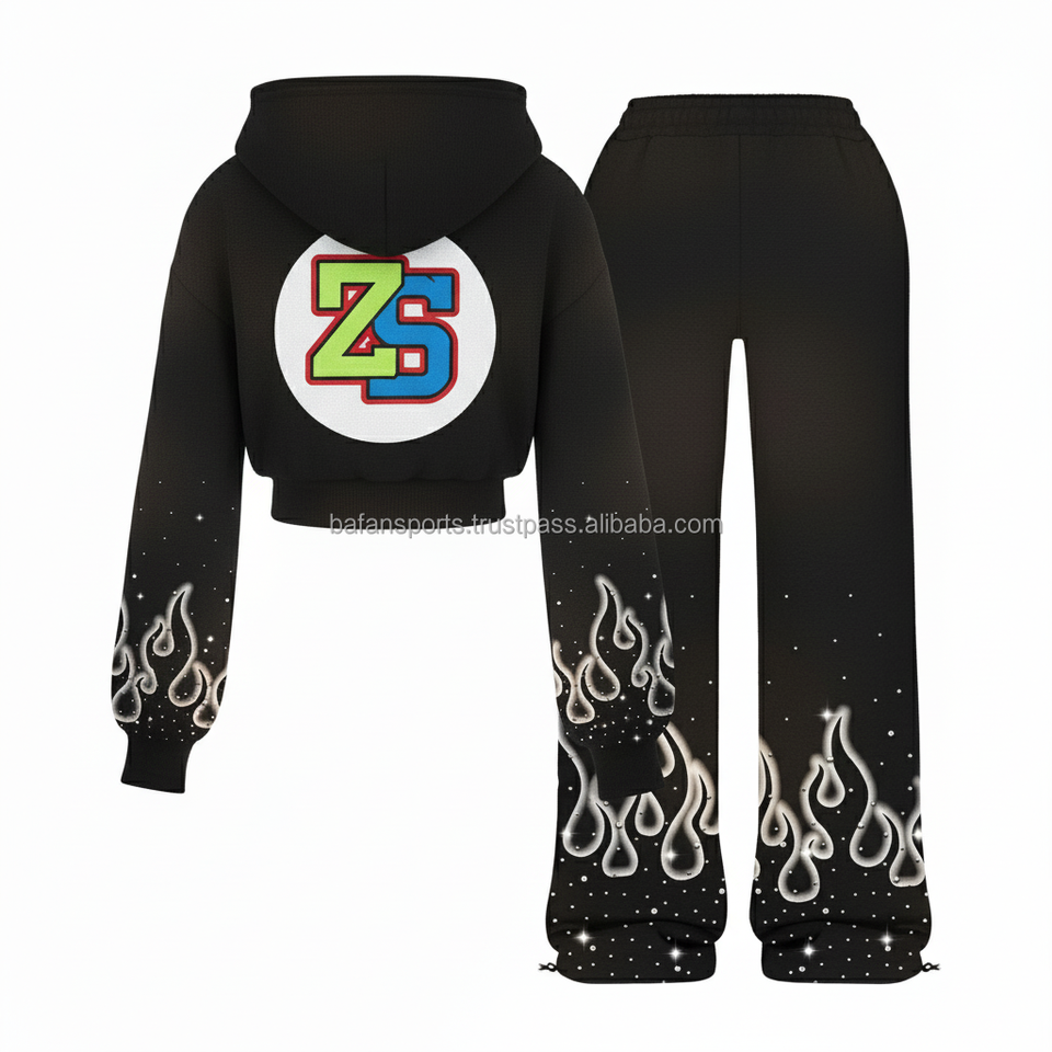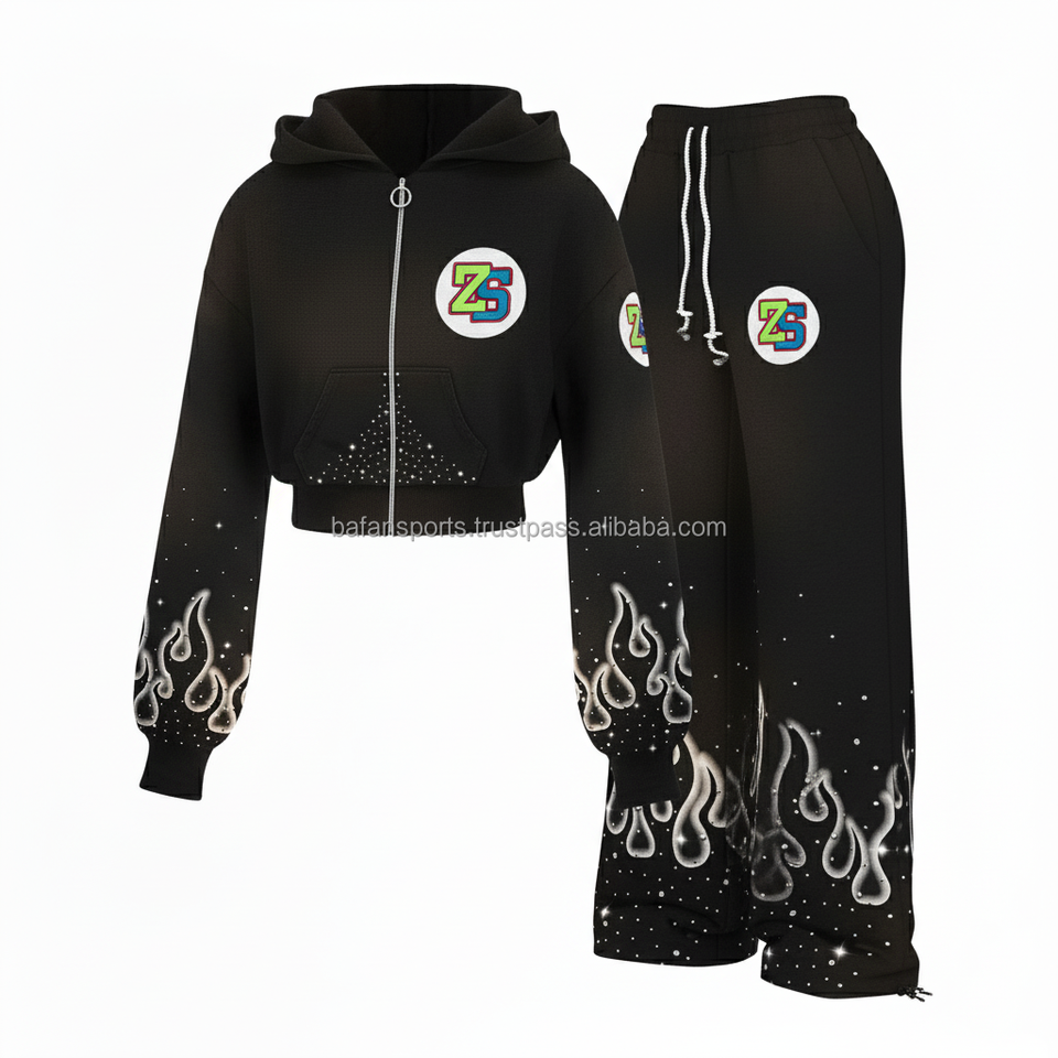 Haute GSM 360 coton Polyester fermeture éclair survêtement flamme dégradé conception taille élastique Logo personnalisé finition presse à chaud