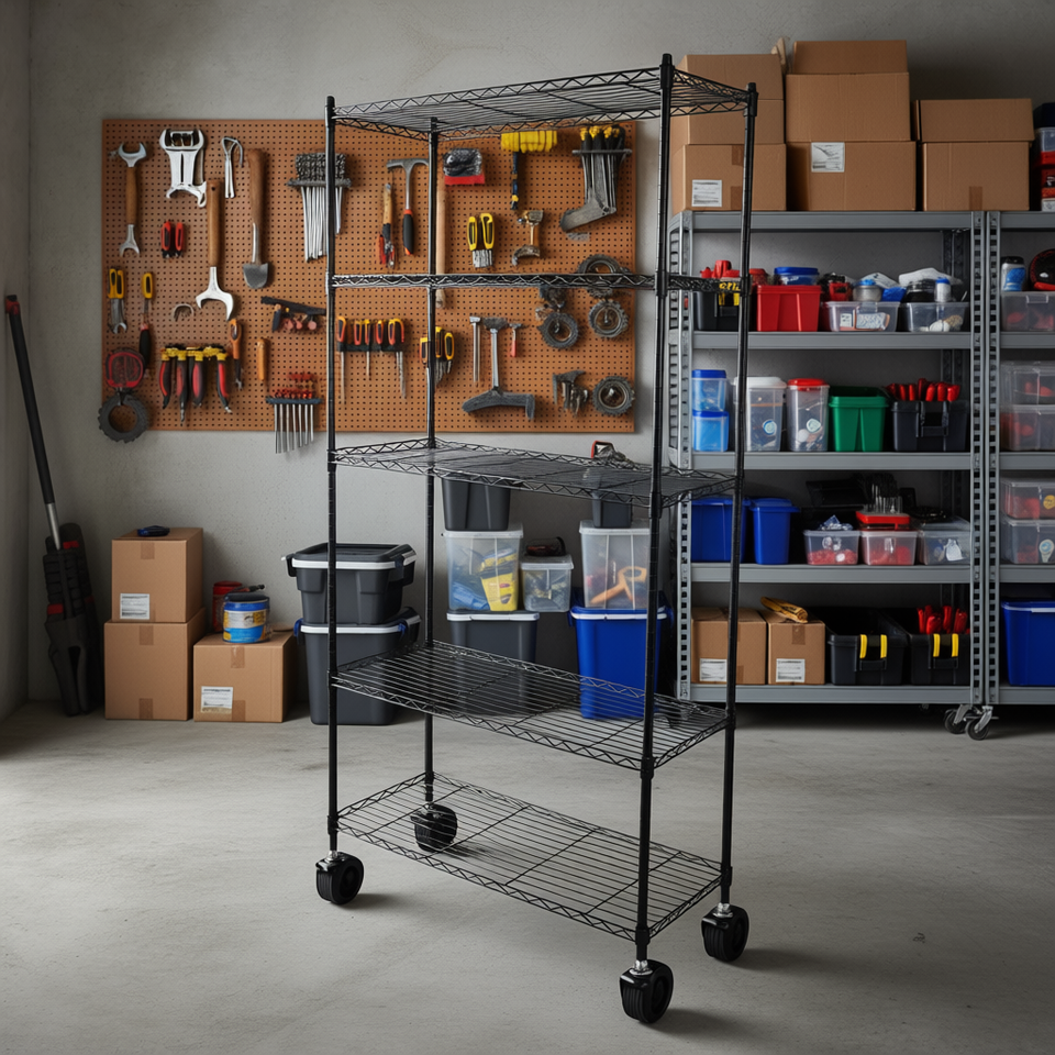 Étagère de garage 5 niveaux en fer noir avec roulettes en nylon de 1,5 pouce pour le rangement dans le garage