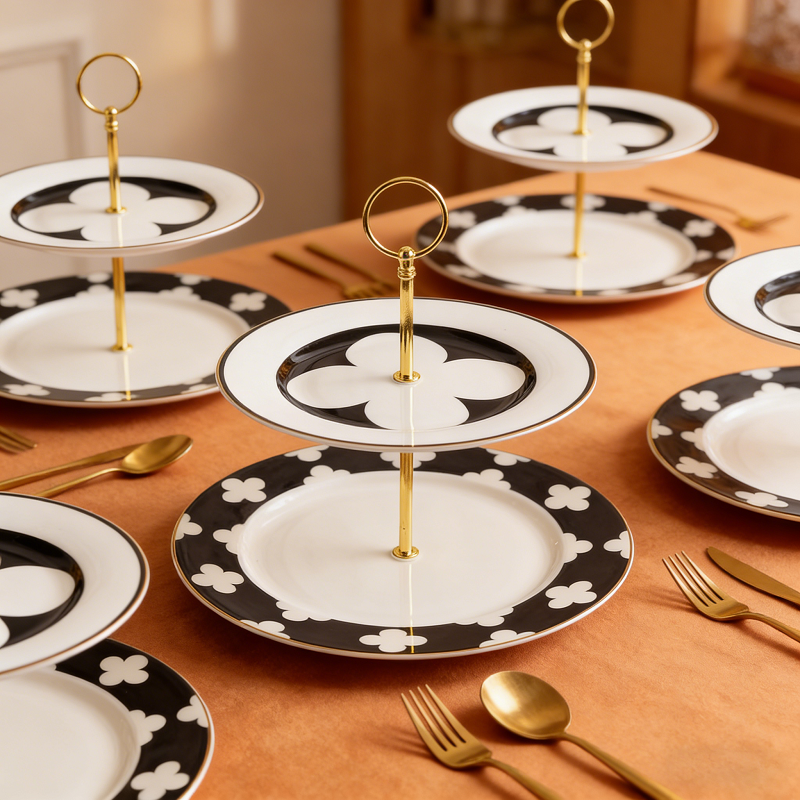 Plateau à dessert à 2 niveaux en porcelaine fine, motif floral ou géométrique, idéal pour la décoration et la présentation de table