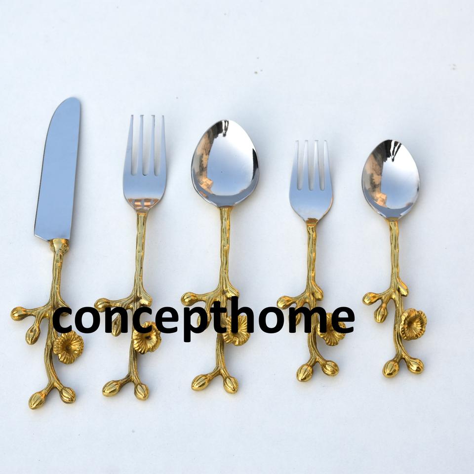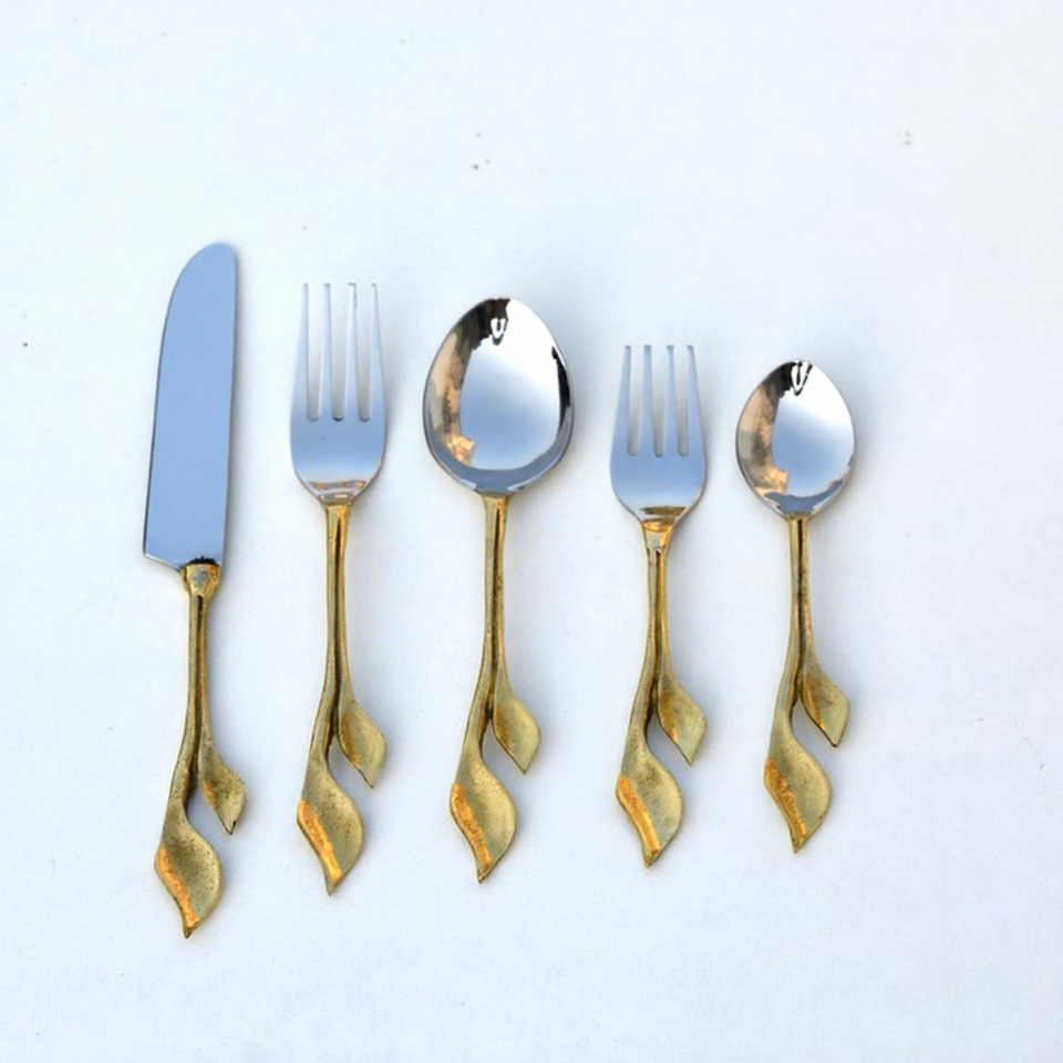 Ensemble de couverts de luxe moderne en acier inoxydable plaqué or de haute qualité avec poignées design en forme de feuilles et finition miroir
